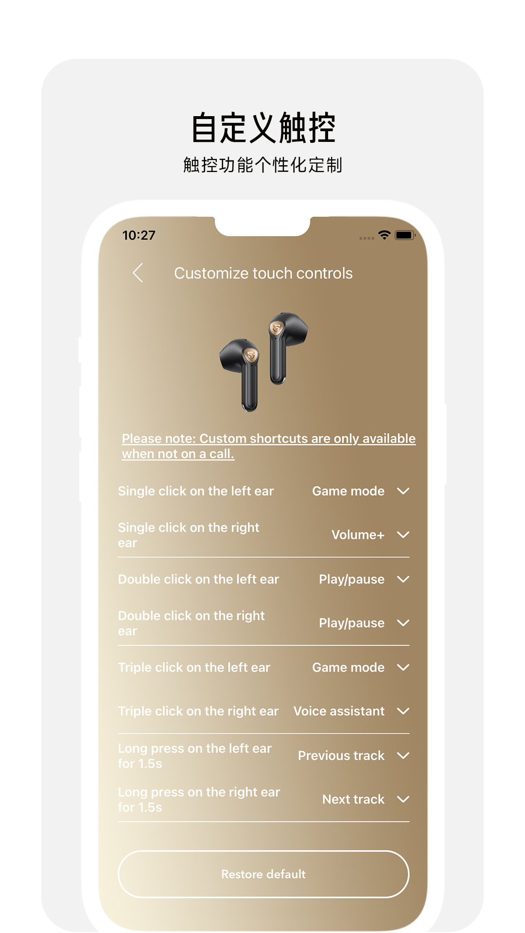 PeatsAudio是SOUNDPEATS系列蓝牙耳机的配套APP。它有着丰富的人机界面,能够为您展现产品中更多的隐藏功能。使用该APP,您可以快速连接耳机,还能对手势操作进行设置与自定义,比如您可以按照自己的习惯定义不同手势对应的功能。同时,您可以通过它控制耳机的音量、进行来电接听操作,以及开启或关闭佩戴检测等功能,这一系列操作无疑进一步提升了产品的价值与趣味性。此外,PeatsAudio为产品提供了固件升级选项,这一功能可使您的产品随时实现升级换代,带来全新的使用体验。