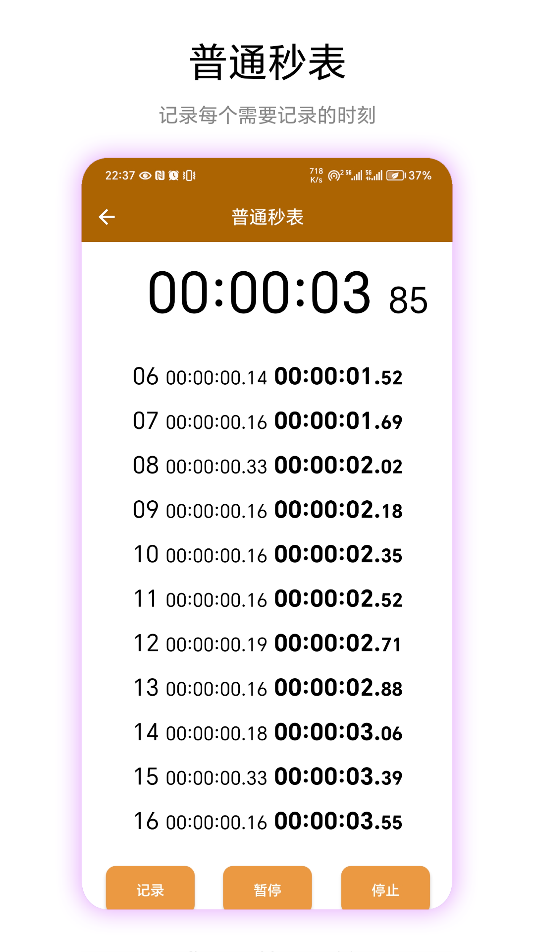 秒表读数是一款极为实用的秒表读数工具。其普通秒表功能能够把每次记录的数据保存成一张图片,这样便于查看数据。而拍照秒表功能可精确到毫秒,在记录数据的同时还能保存图片。此外,它还有棋钟计时功能,这个功能可应用于一些棋类比赛,从而满足不同用户的多样化需求。