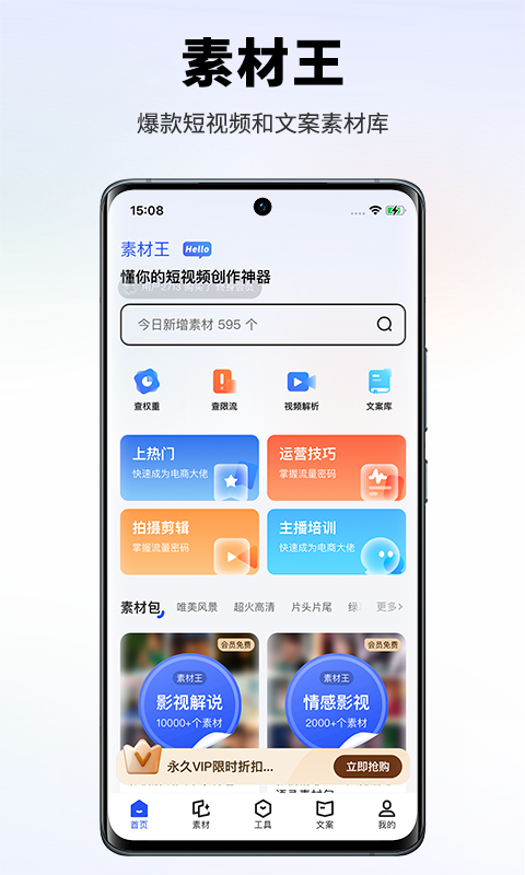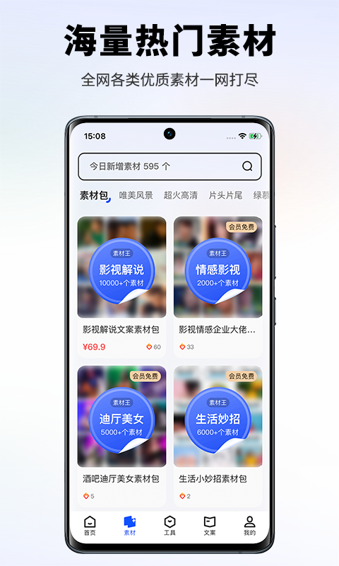 这里汇聚了高质量的视频、音效以及文案合集,还提供高清无水印素材包。热门素材获取超便捷,只需一键,即可轻松拥有。