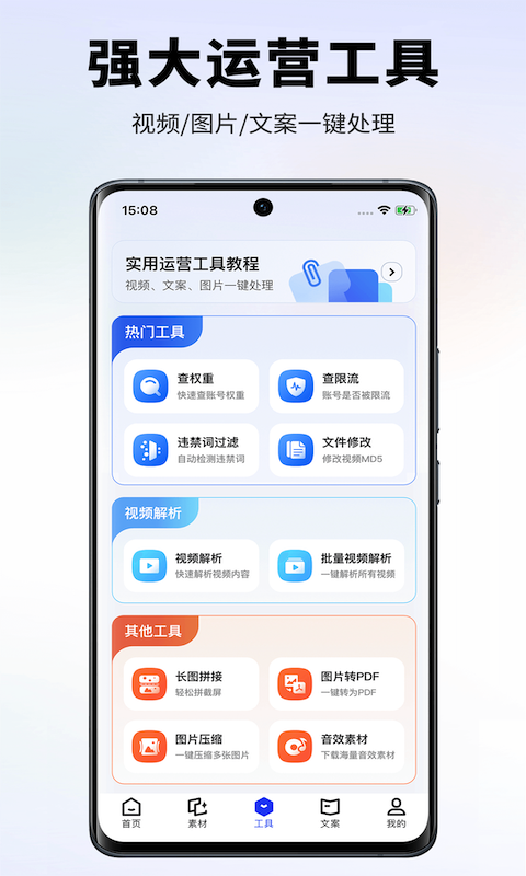 提供多种实用的创作工具,包括视频提取文案、违禁词检测、提词器、数据监控、账号诊断、账号估价、视频镜像、MD5修改、图片转文字、语音转文字、长图拼接以及抖音权重查询工具等。