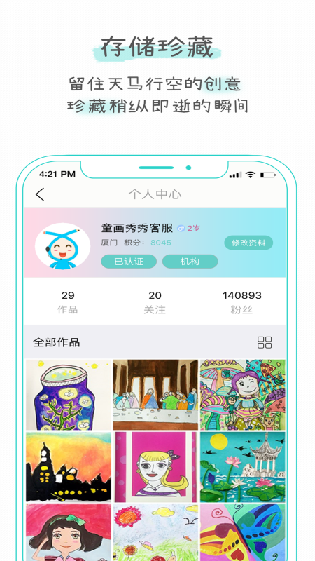 【存储珍藏】孩子笔下的每一幅画都是他们内心世界的表达。童画秀秀会用心地将这些充满童真的画作记录下来,就像珍藏一个个天真无邪的童话。您再也不用为如何妥善保存孩子的画而烦恼,童画秀秀能够轻松留住孩子在画笔下所展现出的每一个天马行空的创意,把那些稍纵即逝的美好瞬间永久珍藏。