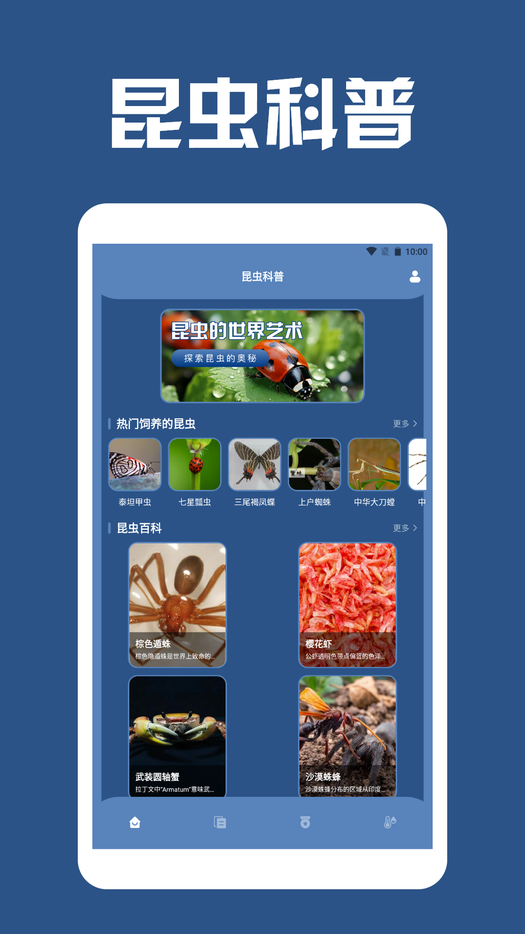 虫虫助守来啦!它将带你走进昆虫的奇妙世界。在这里,你能了解到多种不同类型昆虫的生活习性以及养殖方式,从而学习到更多昆虫知识哦。