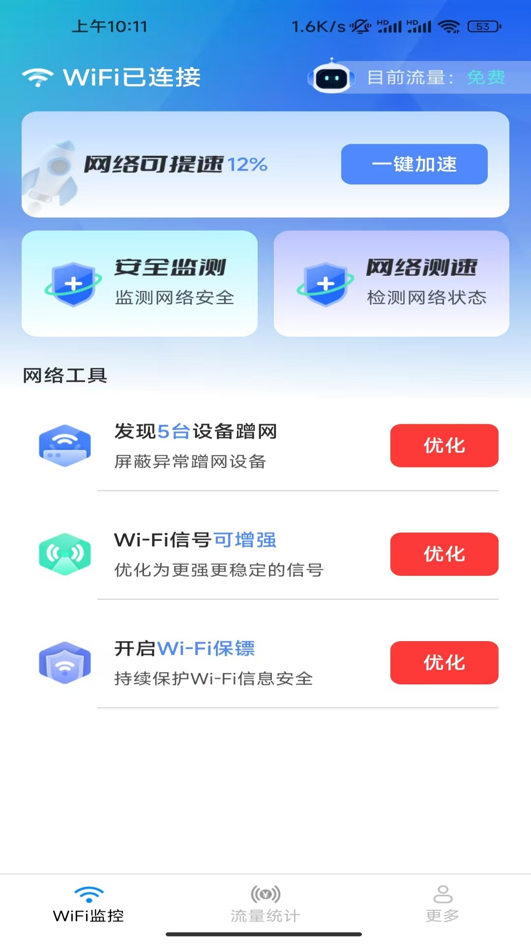 【WiFi监控】可以网络优化提速、安全监测、网络测速、防蹭网优化、信号增强、WiFi保镖等多种上网实用功能集合,让你上网更舒心