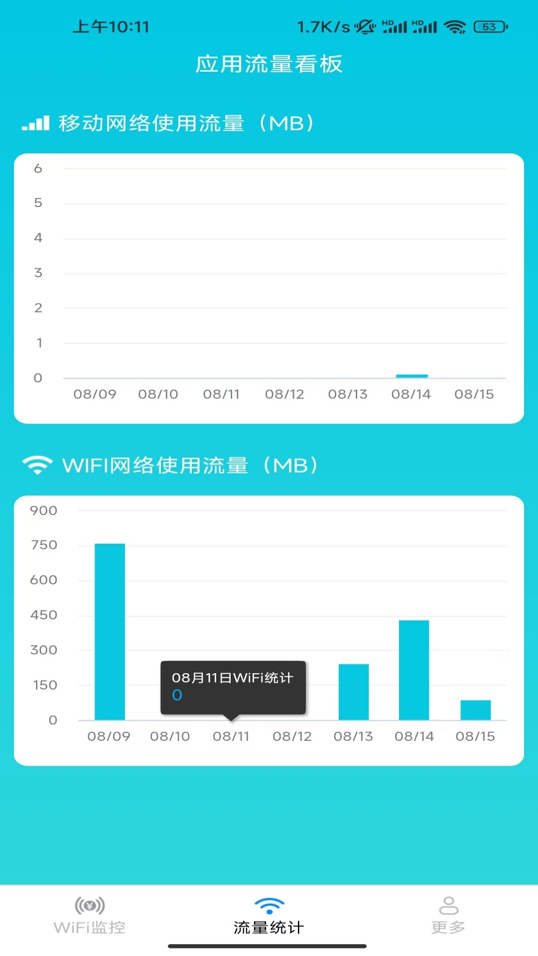 【流量统计】统计近期七天移动流量和WiFi流量的使用情况统计,让你更好把控剩余流量的使用规划。