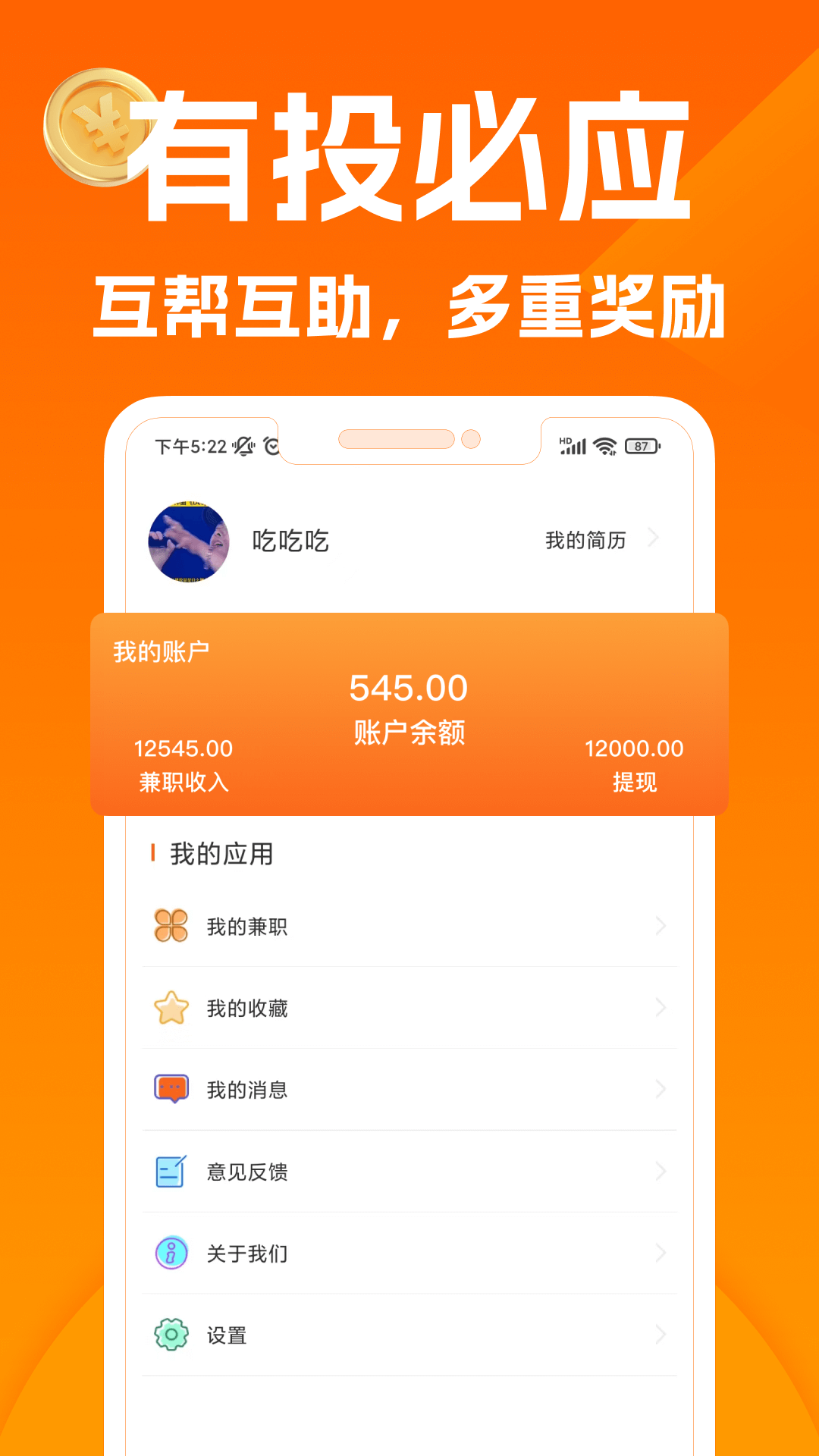快速挣钱:入职速度极快,沟通便捷高效,让您获取高薪兼职;求职信息有投必应,极速反馈,支持在线沟通。