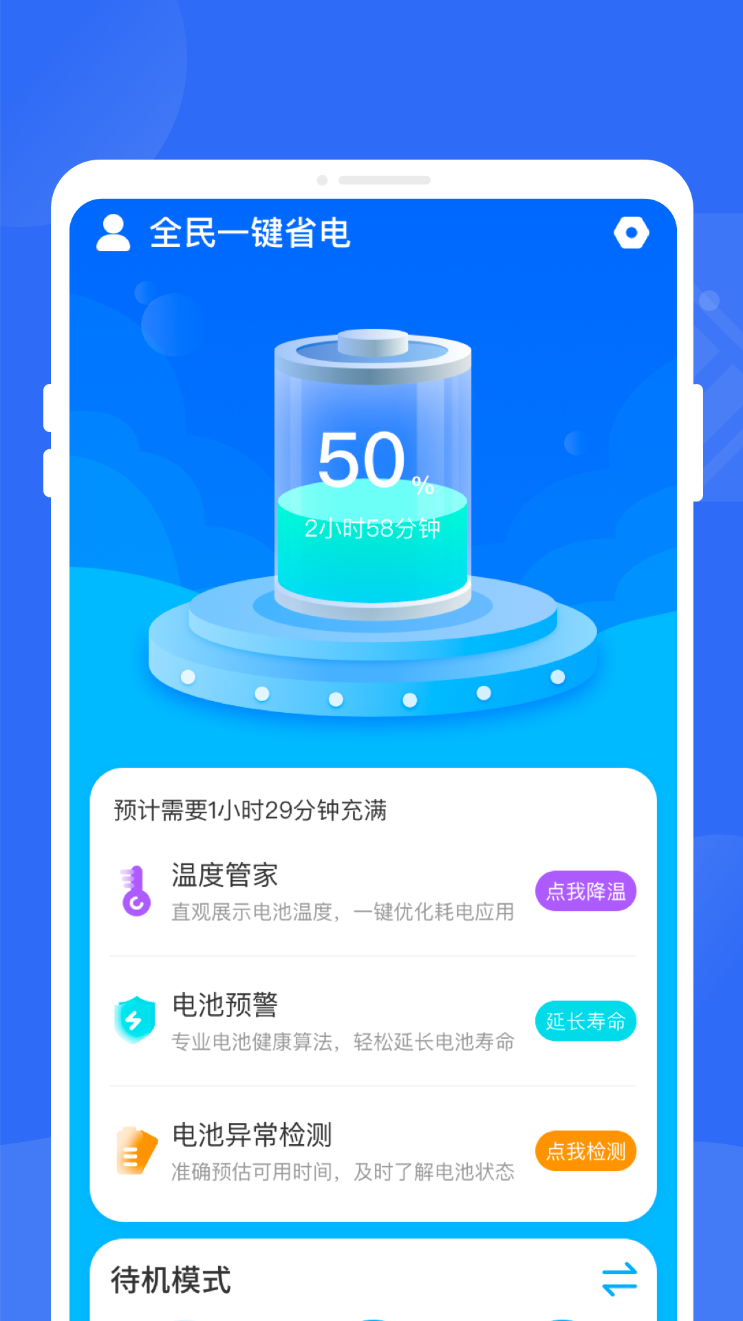 全民一键省电是一款实用便捷的电池健康省电管理软件,能实时跟踪电量变化,实时掌握手机信息,电池健康检测、一键省电、耗电优化,多维度维护电池健康,延长电池寿命。