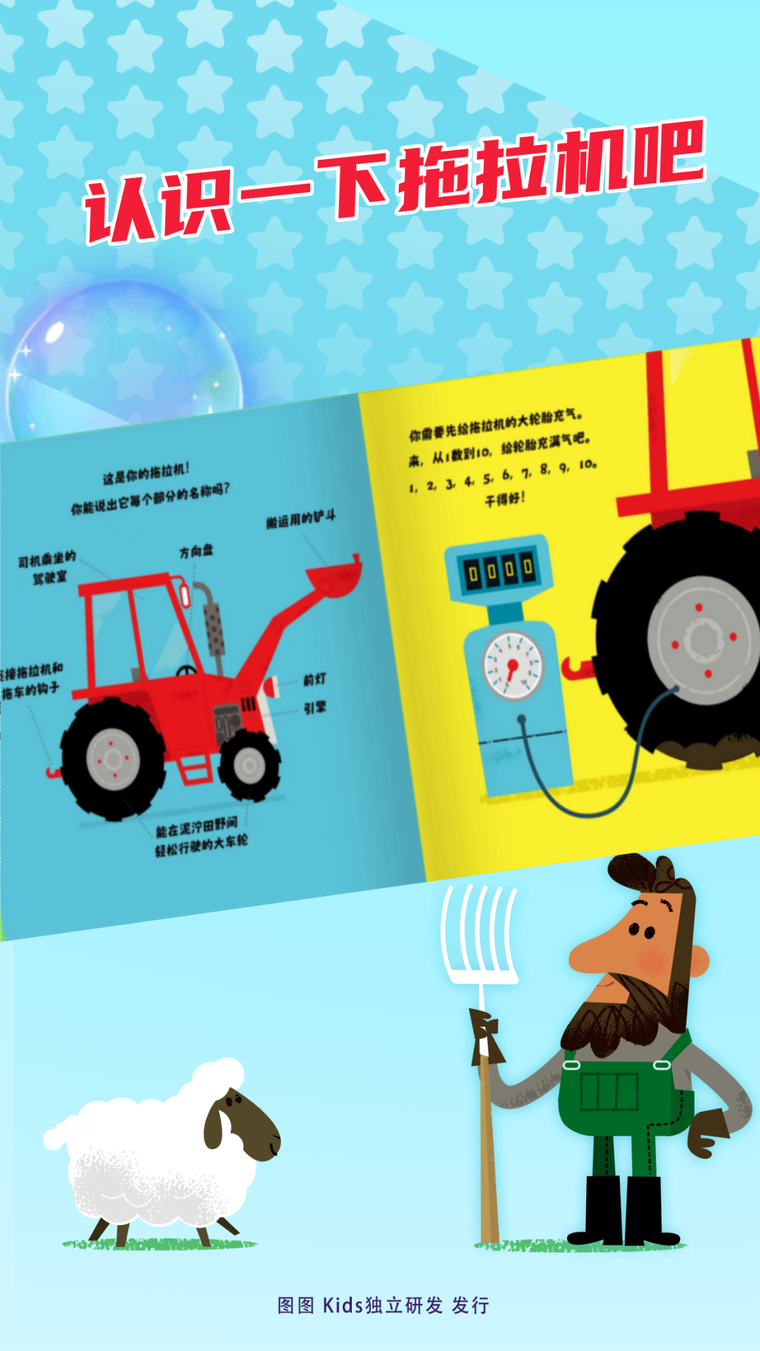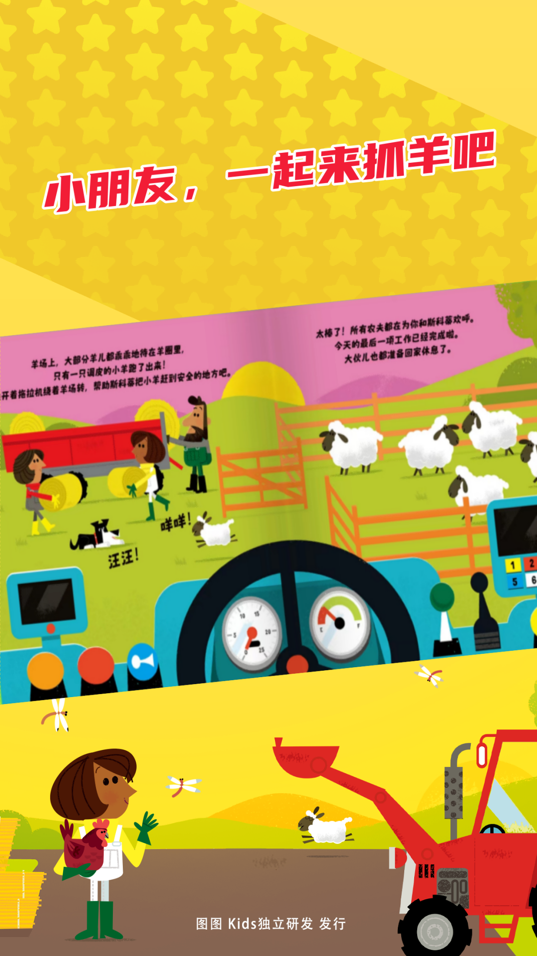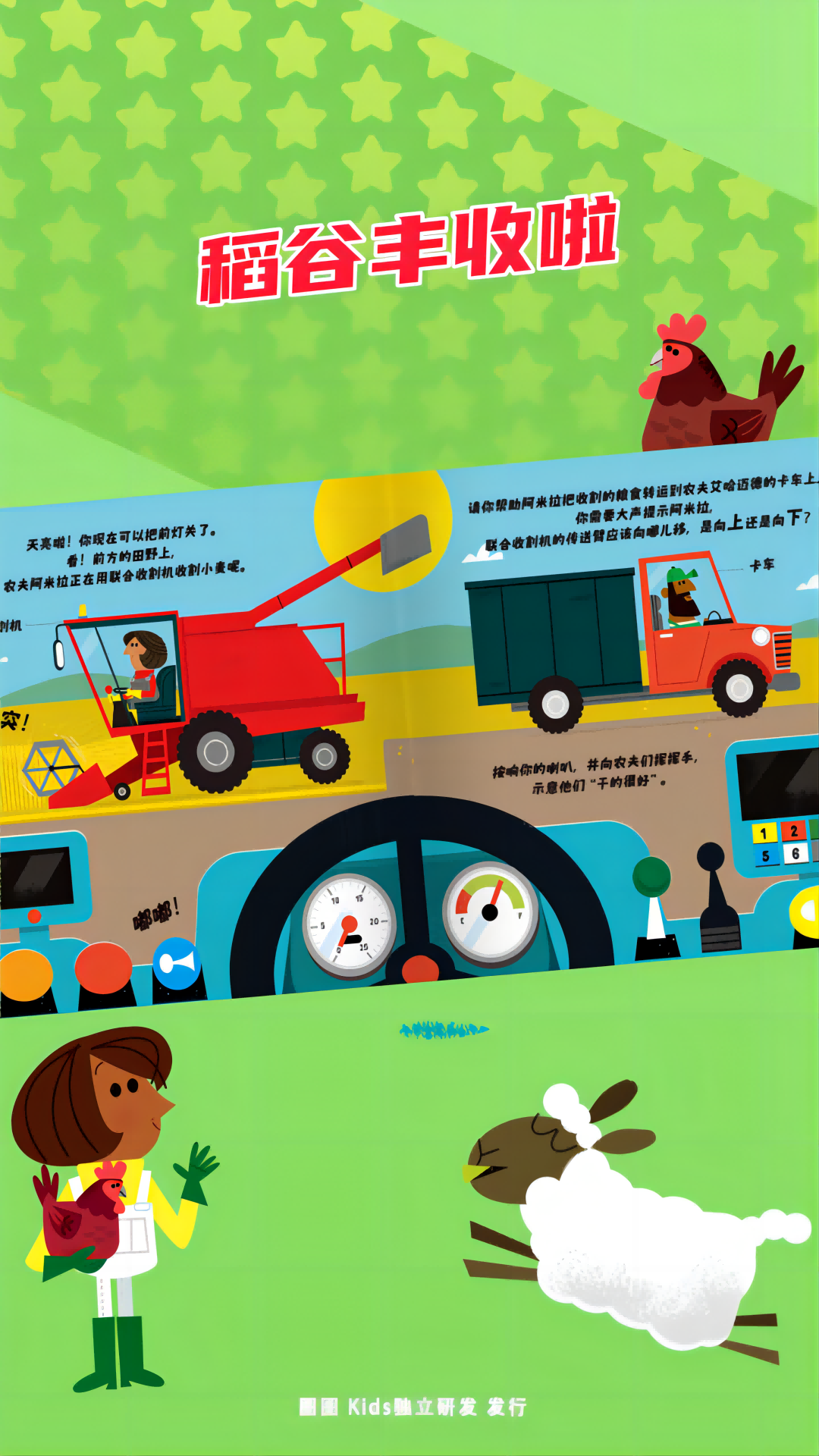 小朋友们,今天你们要成为超级拖拉机小司机啦!还能带上聪明伶俐又能干的牧羊犬斯科蒂一起开始工作哦!看呀,那些饥饿的奶牛、丰收的稻田,还有可爱的小羊羔,都在盼着你们到来呢!