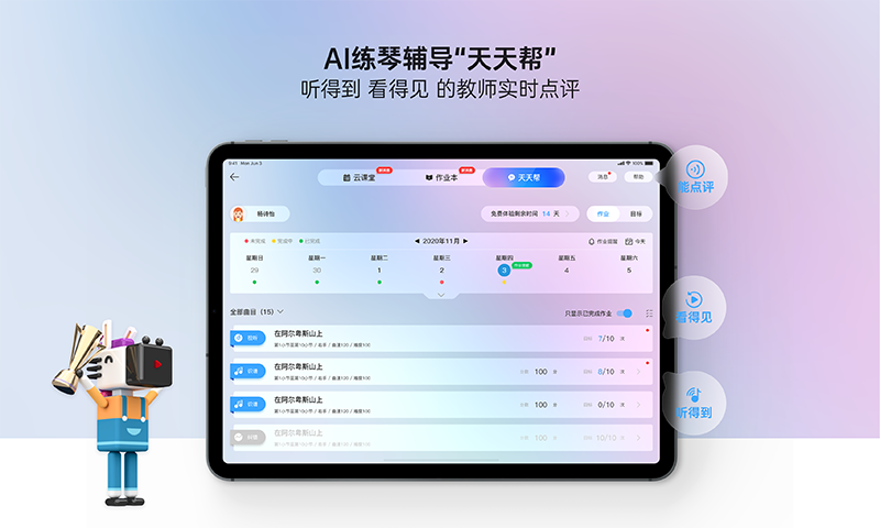 对家长来说,它如同陪练的救星。家长在陪伴孩子练琴时不再头疼,它解决了家长的困扰,家长可以非常直观地监督孩子练琴情况,从而节省出大量的时间。