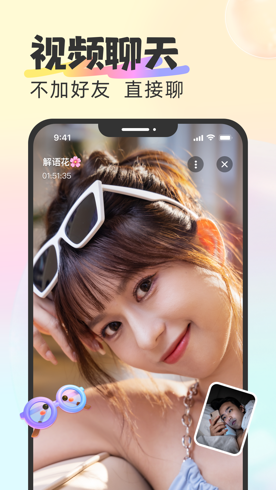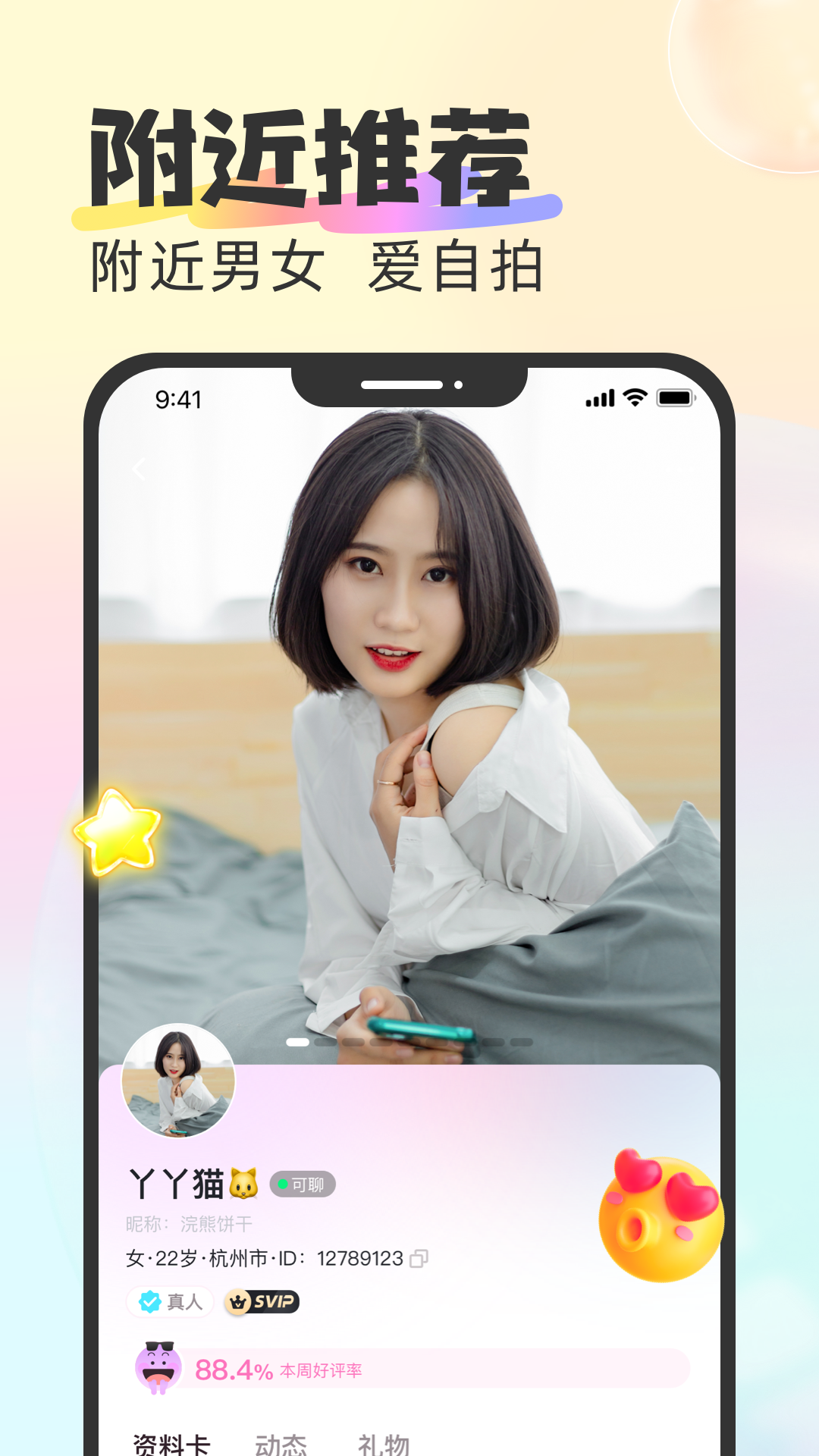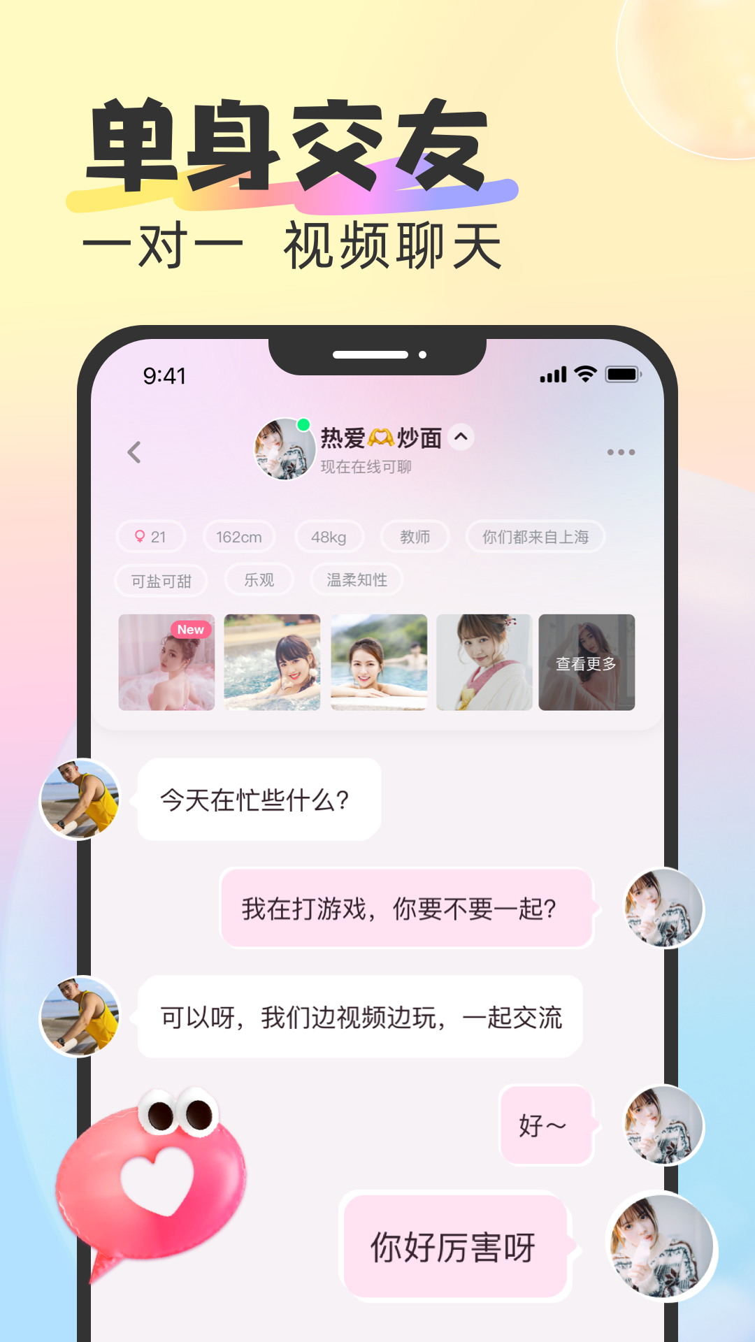 全新聊天交友平台,你可以通过视频、语音、文字等多种方式与同城附近的异性甜蜜互动!