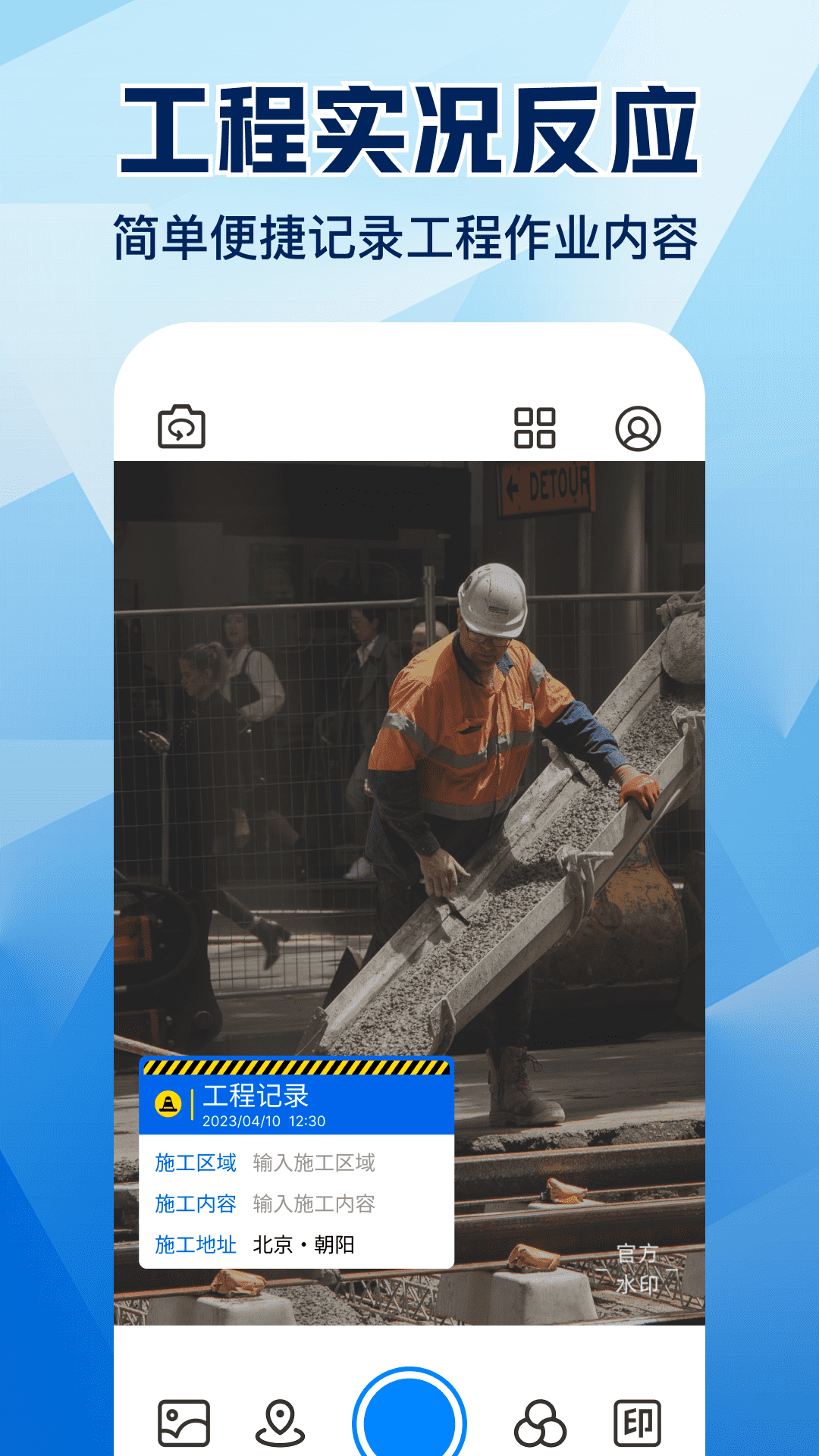 拍照片、拍视频,都能加水印。一键获取当前时间地点作为水印,真实防篡改!拍照即自动加水印,海量水印模板,时间地点精准,是你工作和生活打卡的好帮手。
