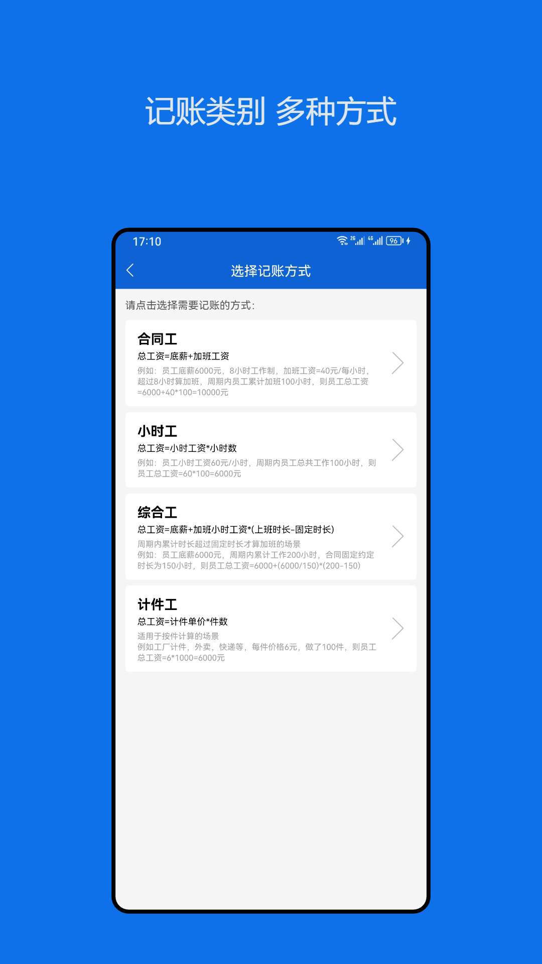 工资计算:按照您设定的薪资标准,应用会自动算出您的工作收入。您可以设定不同的工作项目与薪资等级,从而准确计算每项工作的报酬。