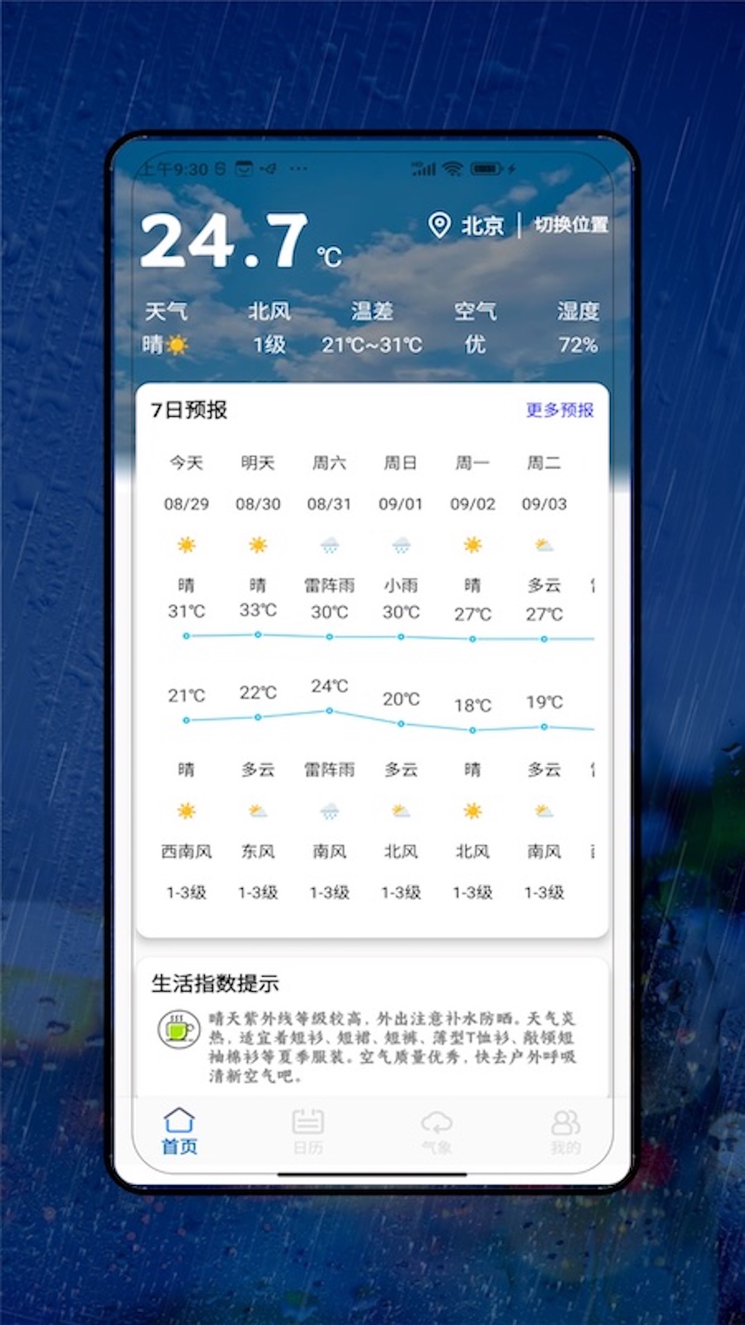 7日天气采用权威数据源授权预报信息,天气预报信息精准查询,可查看全国各地的实时天气预报、24小时预报、7天预报、空气质量指数等预报信息。精准定位,语音播报天气。提供您日常所需的穿衣、钓鱼、紫外线、感冒、运动、洗车等生活指数。