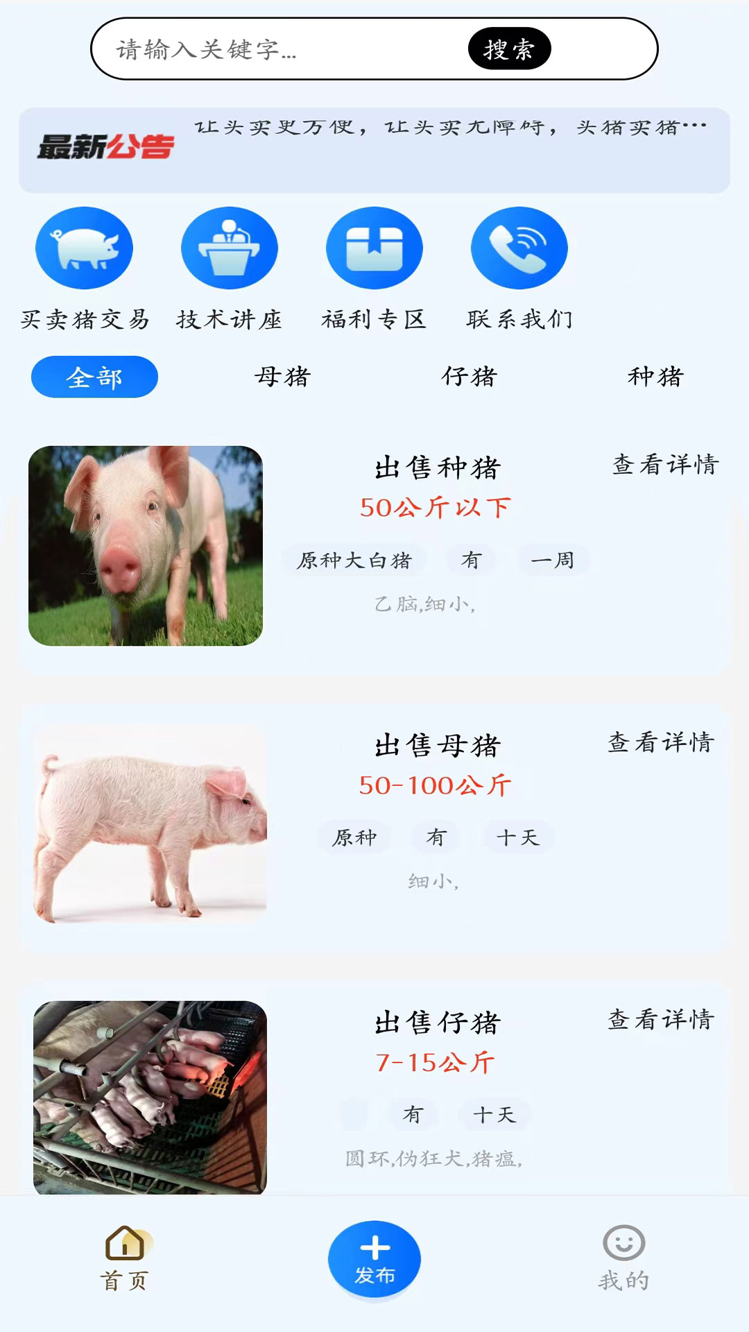 易猪宝app是一款专门为养猪户、生猪调运人、屠宰人员以及生猪运输人员开发的软件。通过该软件,养殖户和经纪人能够更加便捷地发布卖猪信息,生猪调运人员和屠宰运输人员也可轻松获取生猪出售的相关消息。此外,易猪宝app还为养殖户提供养殖技术讲座。