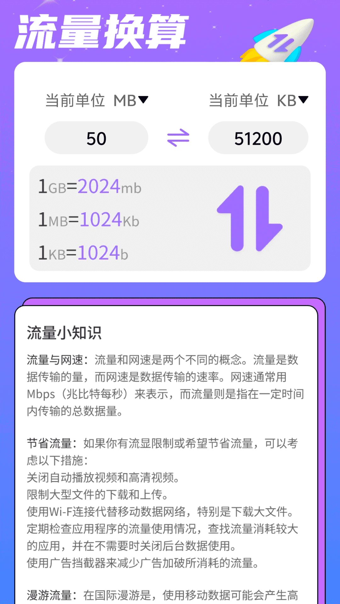 您是不是常常担忧数据流量的消耗情况呢?有了疾速流量就不必再烦恼了。您只要输入相应的数值,它就能立刻为您换算流量,让您可以轻松知晓流量的使用状况,从而有效避免不必要的流量超支。