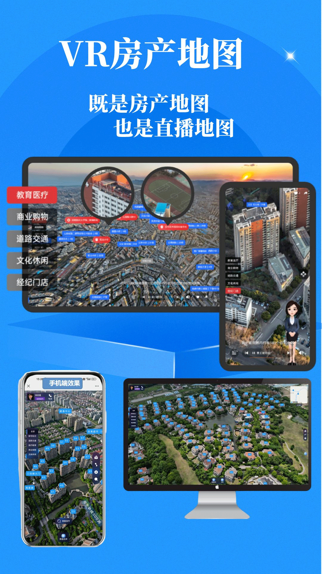 东方云景针对地产数字化营销的一站式解决方案, 地图楼书。VR楼盘字典,VR房产地图,门店沙盘,旨在为客户提供全方位的品牌宣传与营销转化方案。