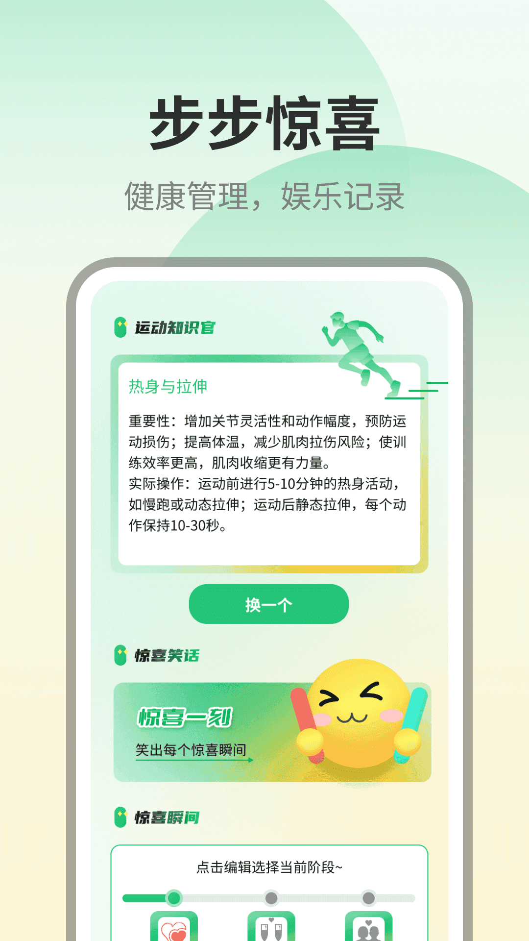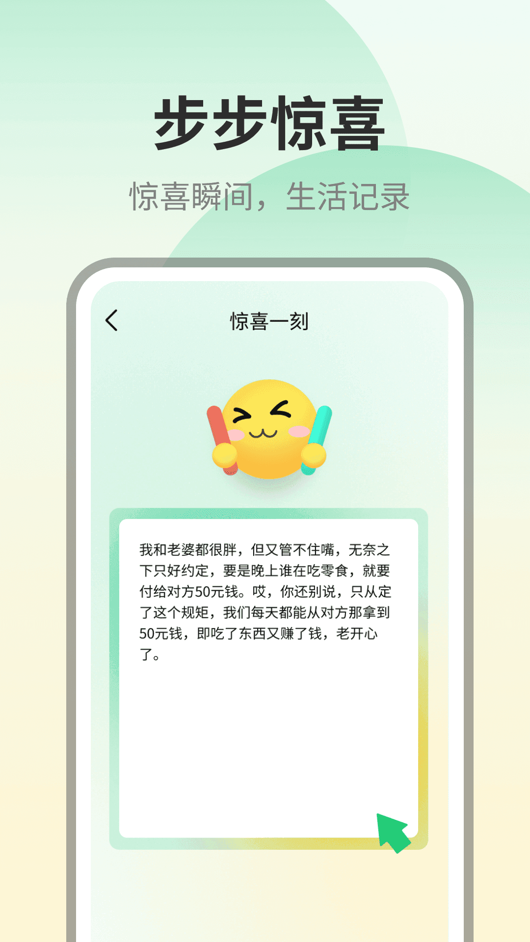 “步步惊喜”是一款结合健康、娱乐与个人生活记录的综合性计步APP。通过每日打卡、精准计步、健康小贴士和心情提升笑话,帮助用户轻松管理健康和情绪。独特的“惊喜瞬间”模块更是让用户能记录生活中的重要时刻,从恋爱到结婚。界面友好、操作简便,是追求健康生活和增强生活质量不可或缺的工具。