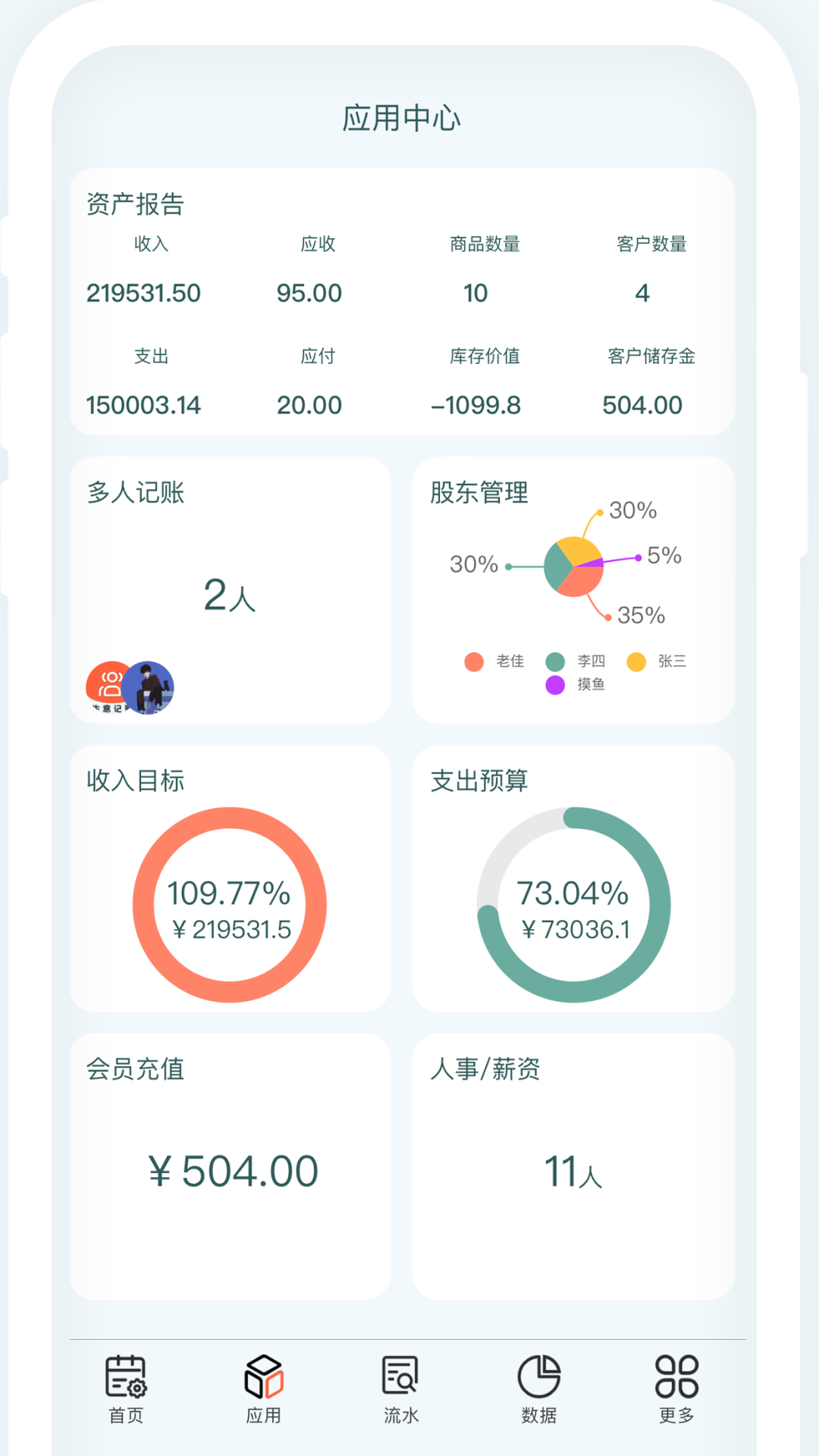 这款软件支持多人记账、客户管理、进销存、薪资管理以及股东管理等多种功能。