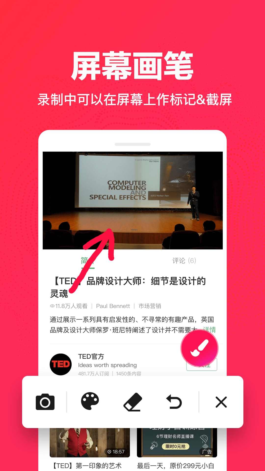 此外,它还有图片编辑功能,图片支持画笔、裁切等操作。录制完成后,能够快速分享,一键将影片分享至视频平台以及朋友圈等社交软件,并且支持区域录制功能。