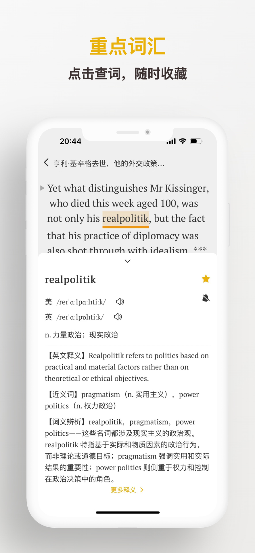 「重点词汇」:您能够在阅读前预习词汇,阅读过程中收藏词汇,阅读之后复习词汇,从而牢牢掌握重点词汇。