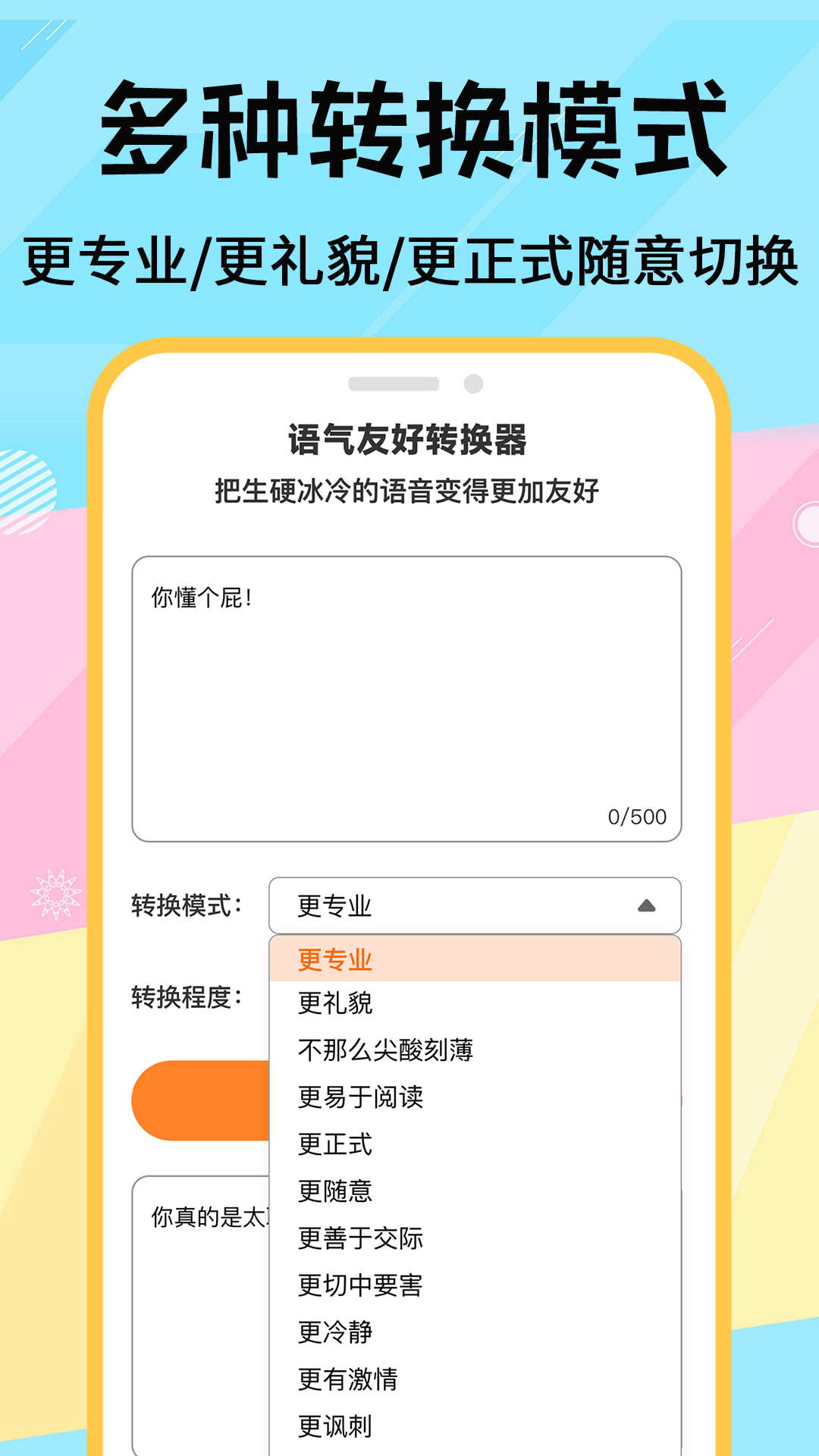 专业版语气转换器!只用简单的几步,你的言语就能变得得体又优雅,高情商就是你!