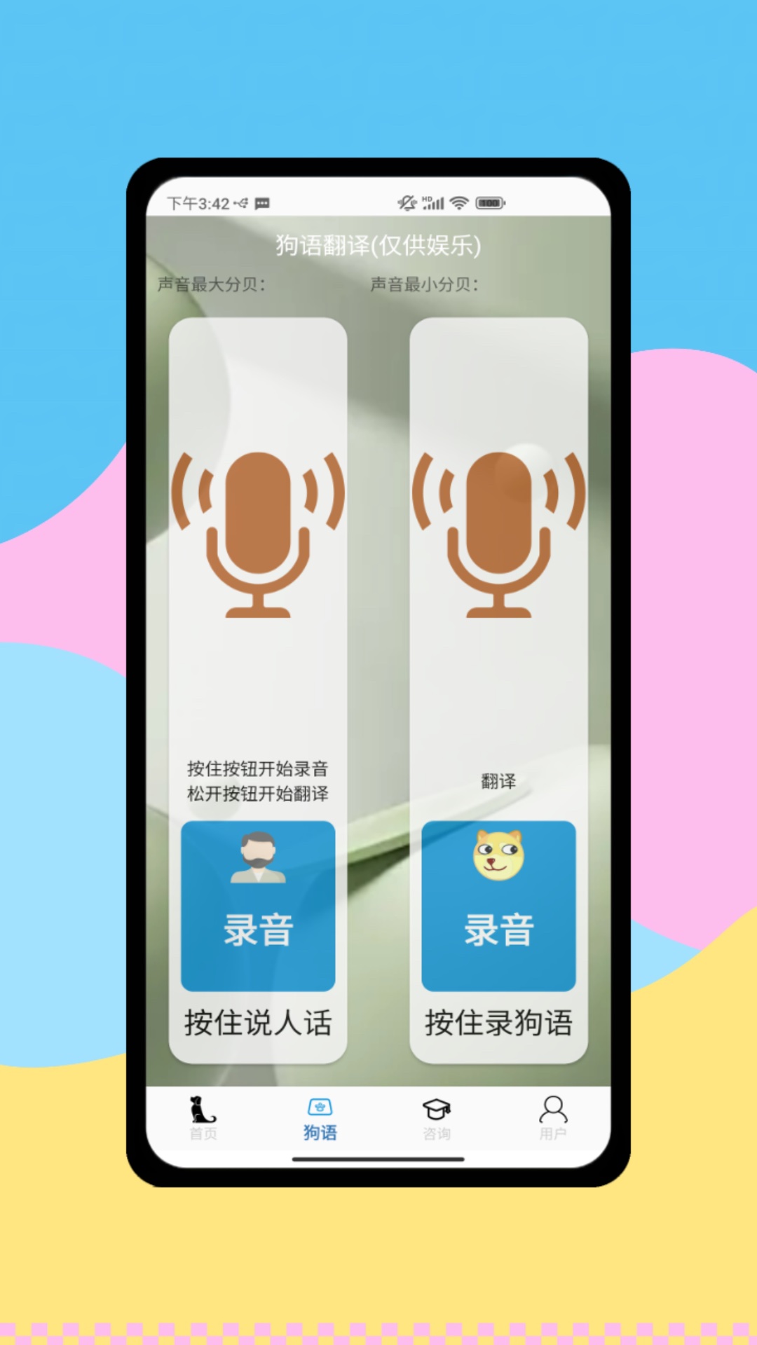 本软件是一款可以实现人狗交流的翻译器,通过人语录音进行采集音频解析,翻译成狗狗想表达的叫声,多种逗狗声音,精心挑选,让家里的汪星人获取注意力进而更亲近您,汇集养狗知识、训练技巧、喂养指南等实用信息。