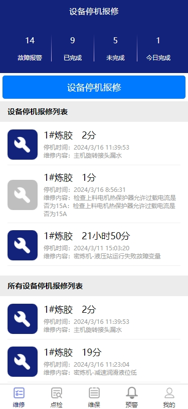 在智能维保app上,能够针对工业设备的点检、维修以及维保等任务开展接收查看、结果上报以及审核等操作。