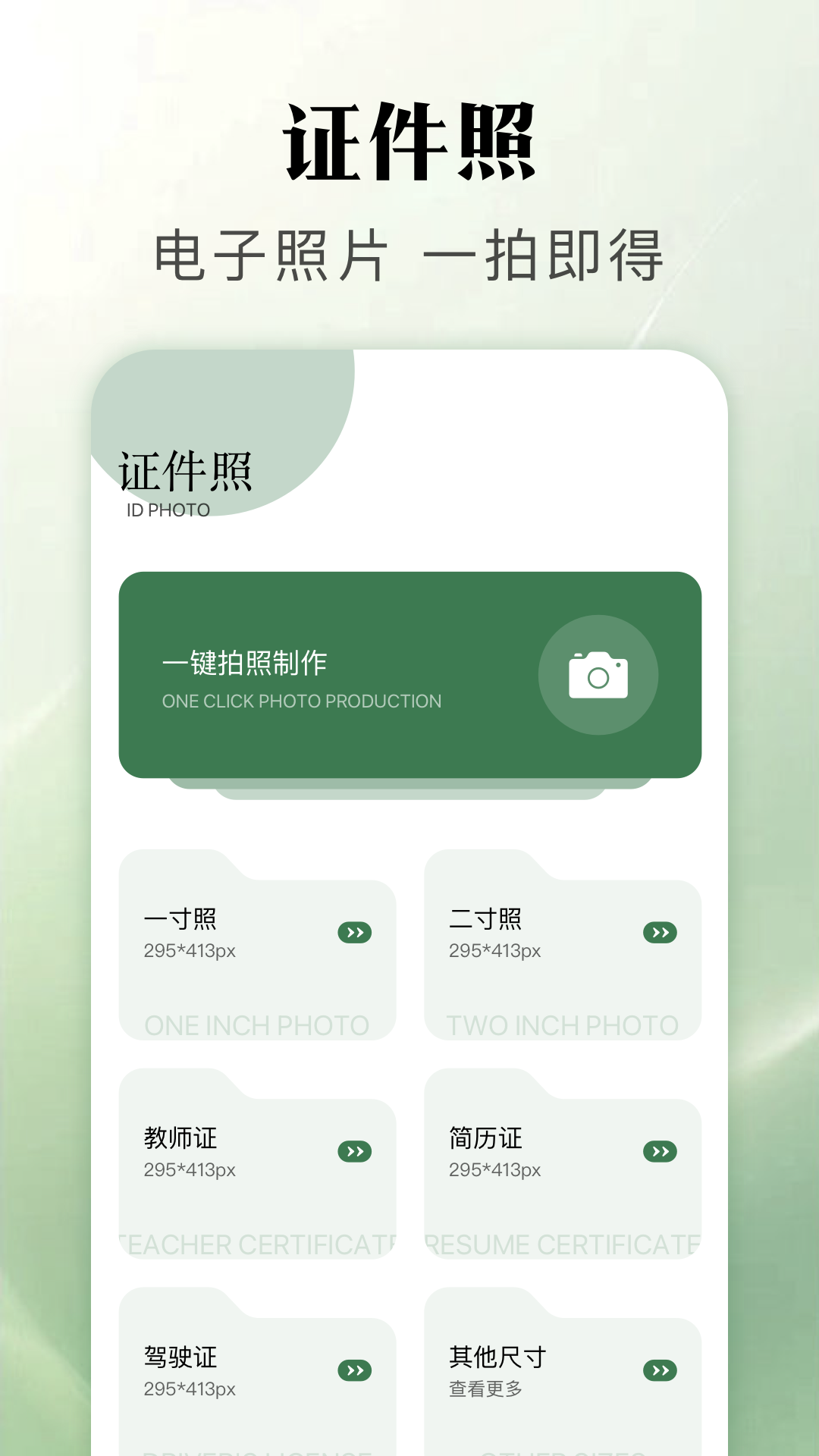 APatch的证件照功能便捷又高效,一键就能完成拍照制作。它涵盖了一寸照、二寸照等常见尺寸,同时也能满足教师证、简历证等特定证件照需求,您还可以查看更多尺寸的选择。