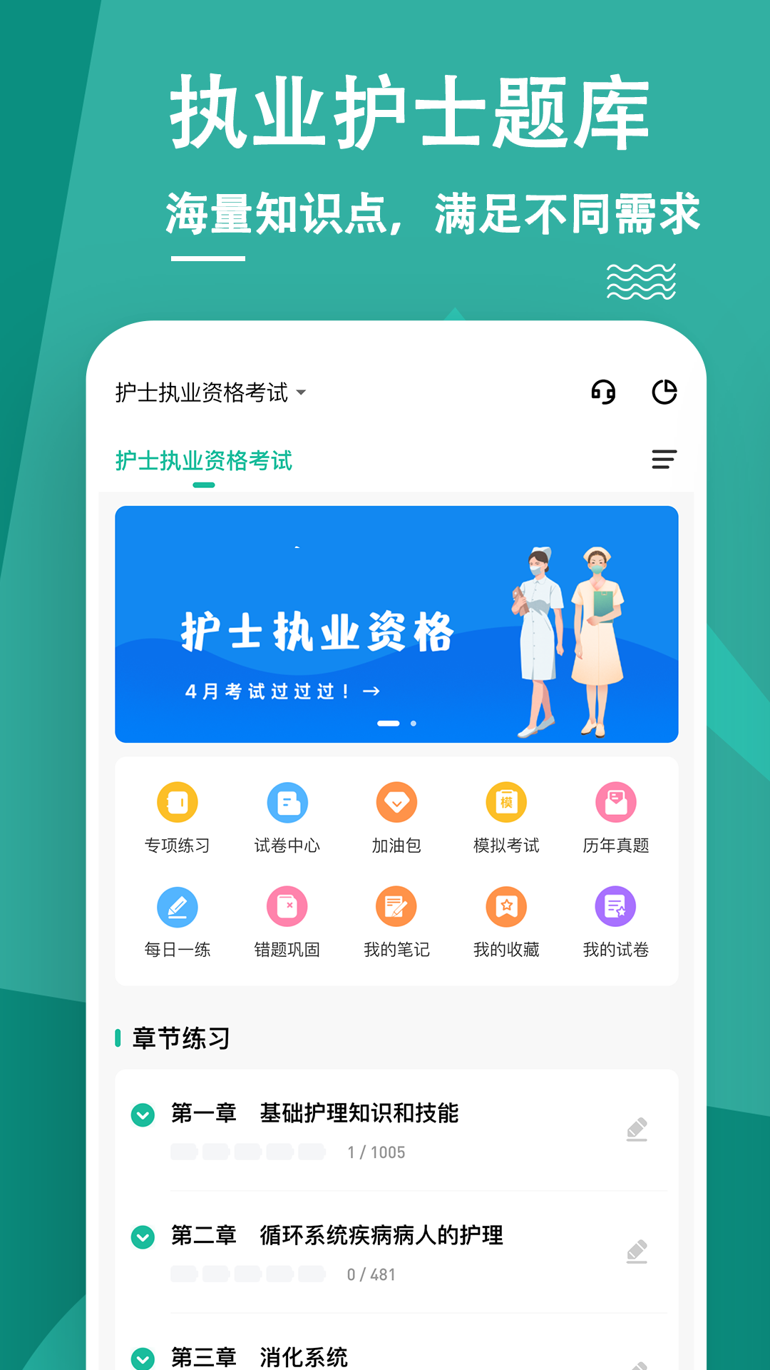 这款软件提供了丰富的题库练习资源,包括章节练习、历年真题以及预测试卷。其内容全面覆盖护士资格考试的易考考点,同学们在复习时能够利用它查漏补缺,精准掌握考试的重点与难点,进而提升综合分析能力并拓宽知识面。