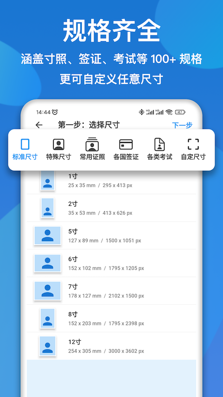 1. 规格尺寸超全。包含标准尺寸、常用尺寸、常用证照、各国签证、各类考试等众多类型,常见规格尺寸多达数十种。而且还能自行输入宽高数值,自定义任意尺寸,以此满足特殊需求。