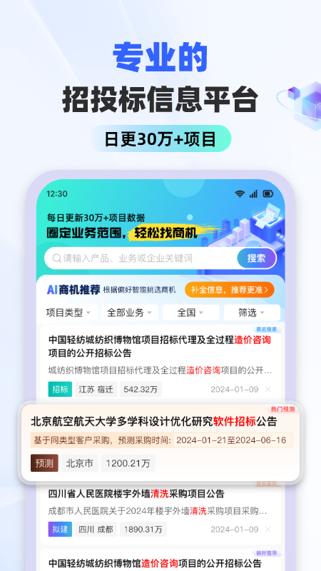 优质项目匹配:每天更新30万 +的项目,项目覆盖全国全行业,具备8000 +个采招数据源、800万 +采购单位资源以及1万 +行业头部战略合作企业,能帮助您找到优质的甲方项目资源。