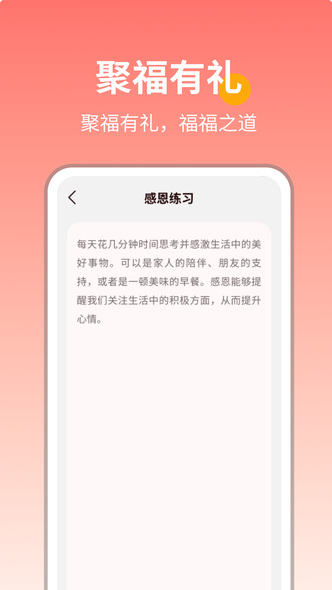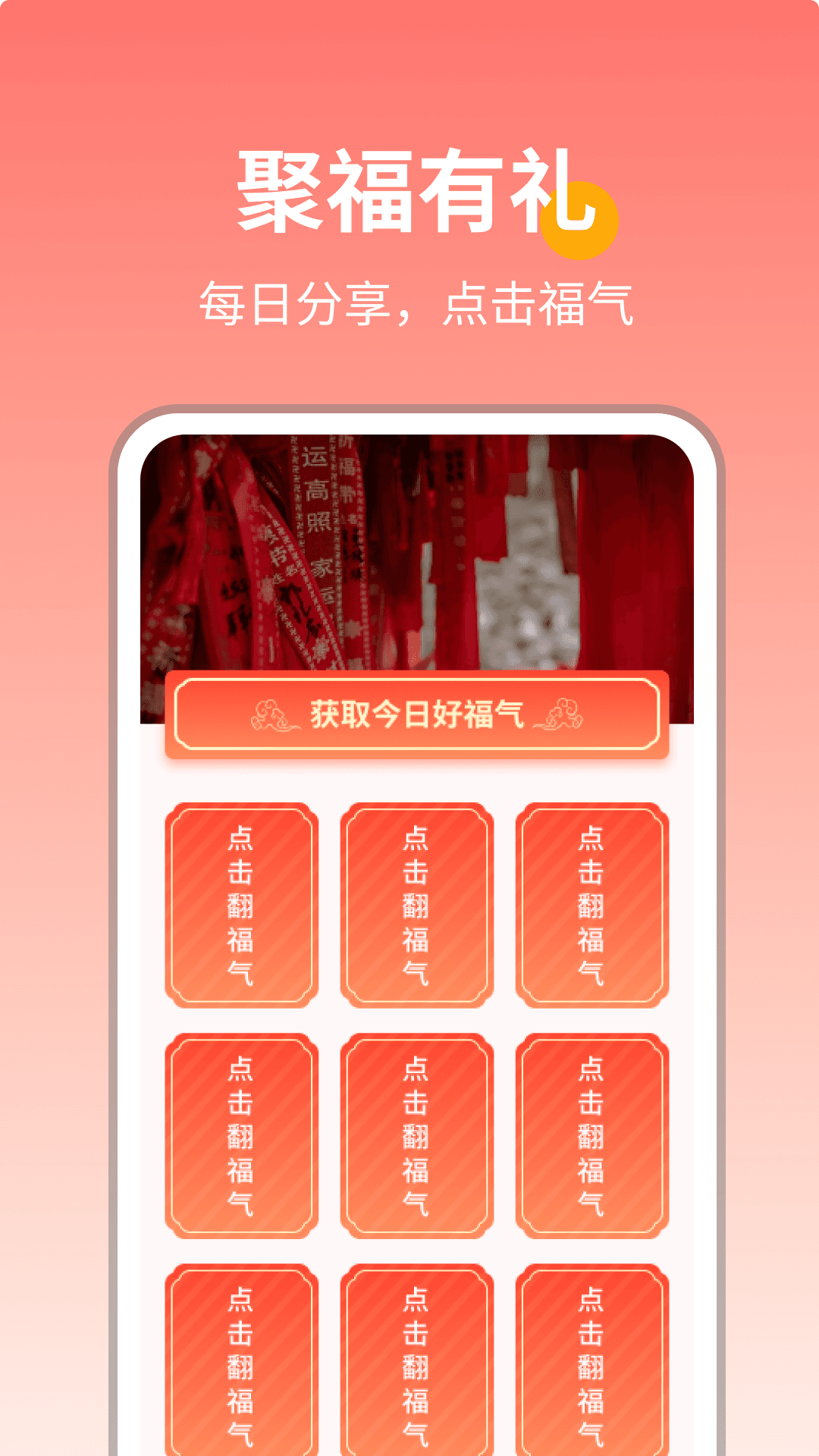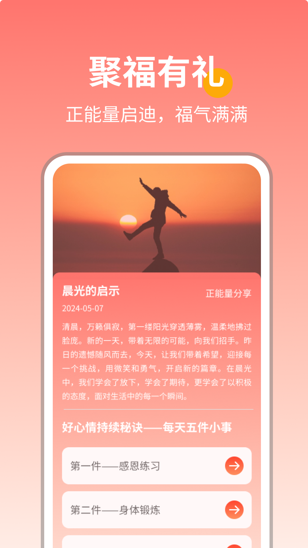 聚福有礼是一款集每日正能量分享、保持好心情秘诀和点击获取福气卡于一体的手机应用,旨在为用户带来每日正能量的启迪和让福气满满的惊喜。不论您是需要每日正能量的分享,还是想要保持好心情,点击获取福气卡,聚福有礼将陪伴您享受生活中的福福之道。
