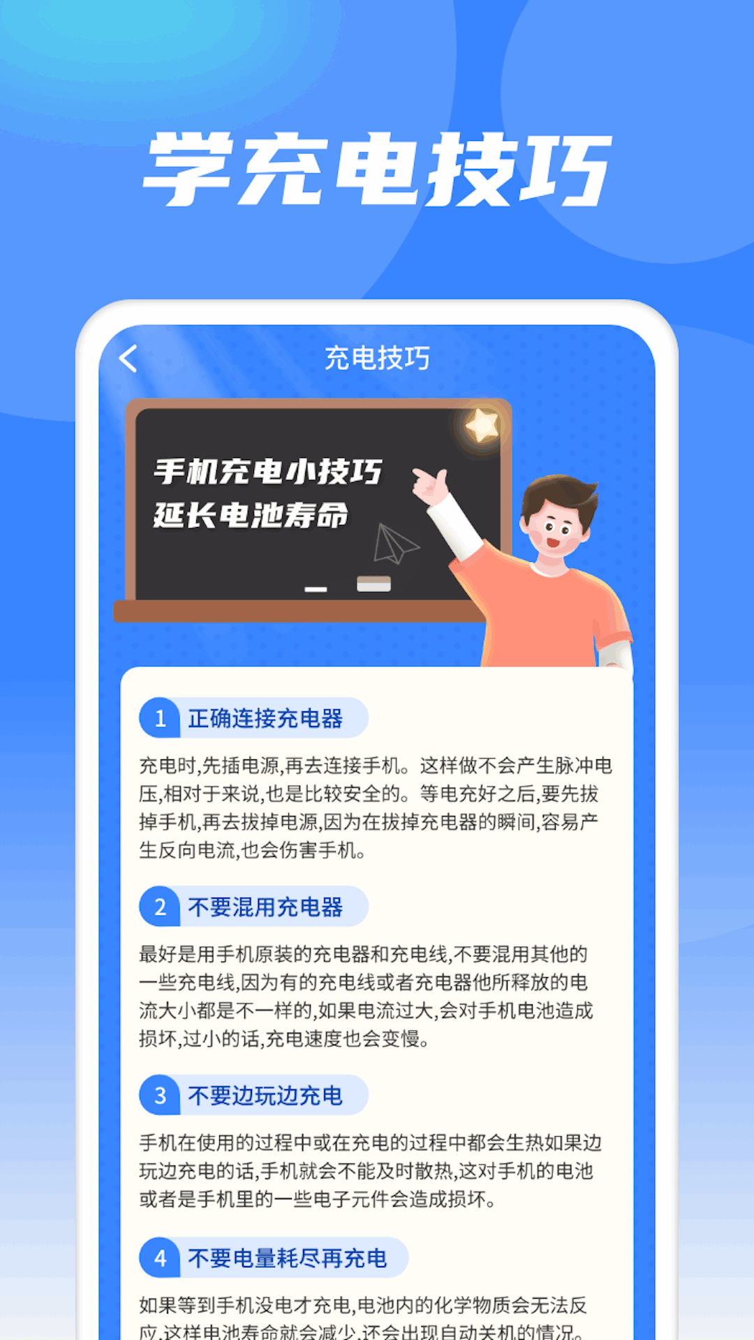 充充吉祥不仅显示充电的电池状态和充电技巧小知识,还有一个非常人性化的设计—脑筋急转弯,让你的手机充电变得更加有趣和高效。