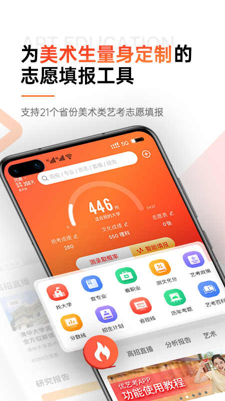 优艺考是为美术生量身定制的志愿填报工具。有关艺术报考方向规划、招生政策、报考大学等信息,只需一个APP就能全面了解,优艺考将照亮考生的艺术升学之路。