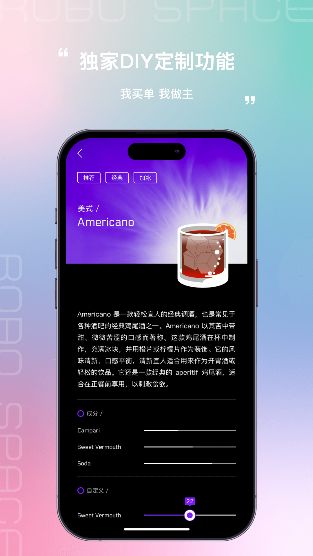 [Robo Space] 酒品选择丰富多样,而且我们的智能推荐系统会根据您的喜好,向您推荐最适宜的酒品。我们的现场互动装置能够带领您进入一个沉浸式的酒品体验世界,让您仿佛身临其境般地享受品酒之旅。赶快立即下载 [Robo Space],开启属于您的个性化酒品探索之旅吧!