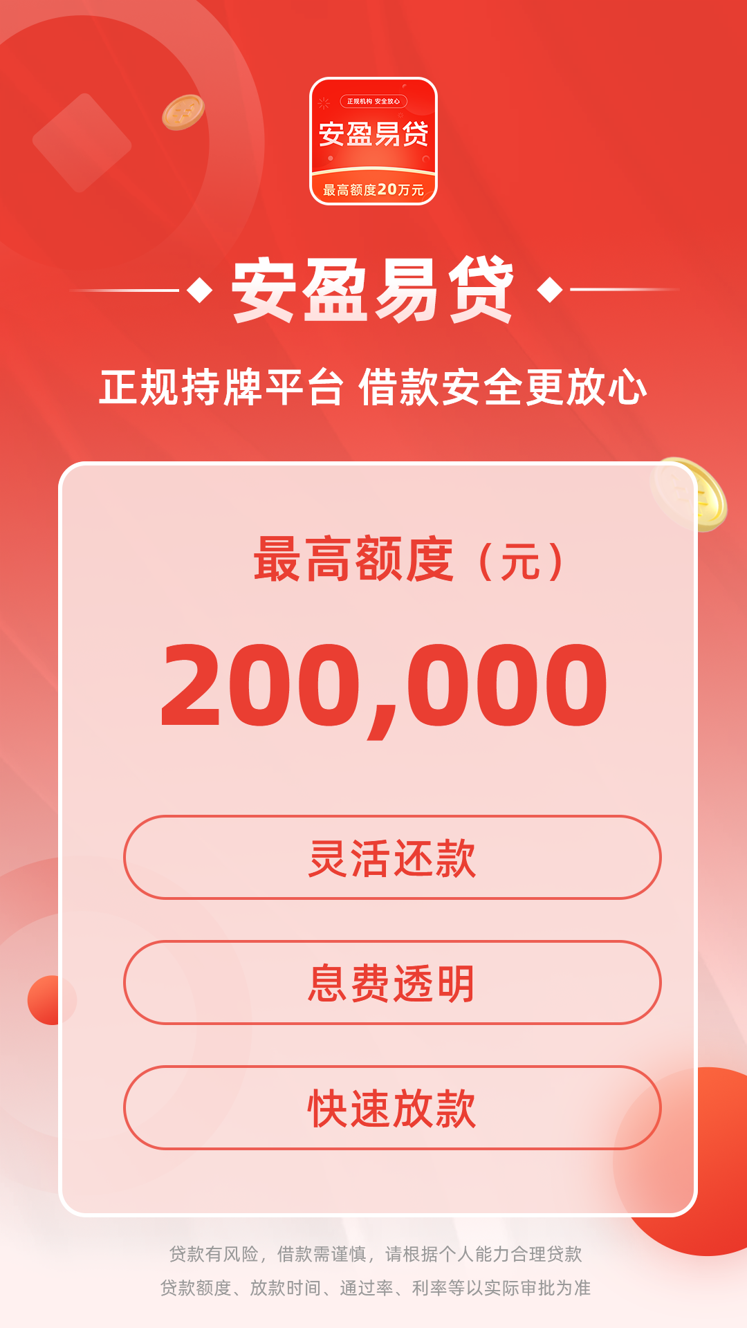 安盈易贷是本公司推出的无抵押、纯线上消费信贷平台,致力于为个人和小微企业主提供贷款服务,款项能够即时到账。