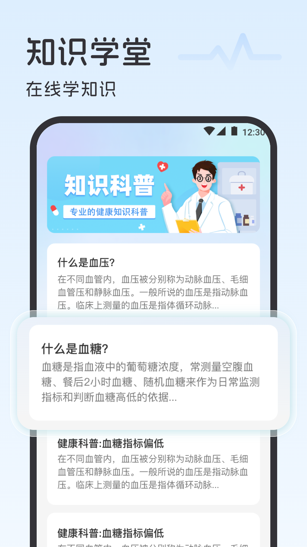 3. 知识科普:我们在应用内设置了丰富的健康知识库,这个知识库包含了血压血糖管理的各个方面内容。从最基础的知识到疾病预防策略,应有尽有,能帮助您以科学的方式认知健康知识,从而远离疾病的困扰。