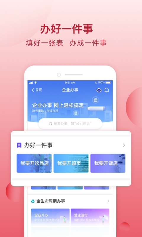 2.办好一件事:提供主题事项的移动端办理,目前已上线“我要开超市”、“我要开饭店”等八十项办好一件事主题服务。