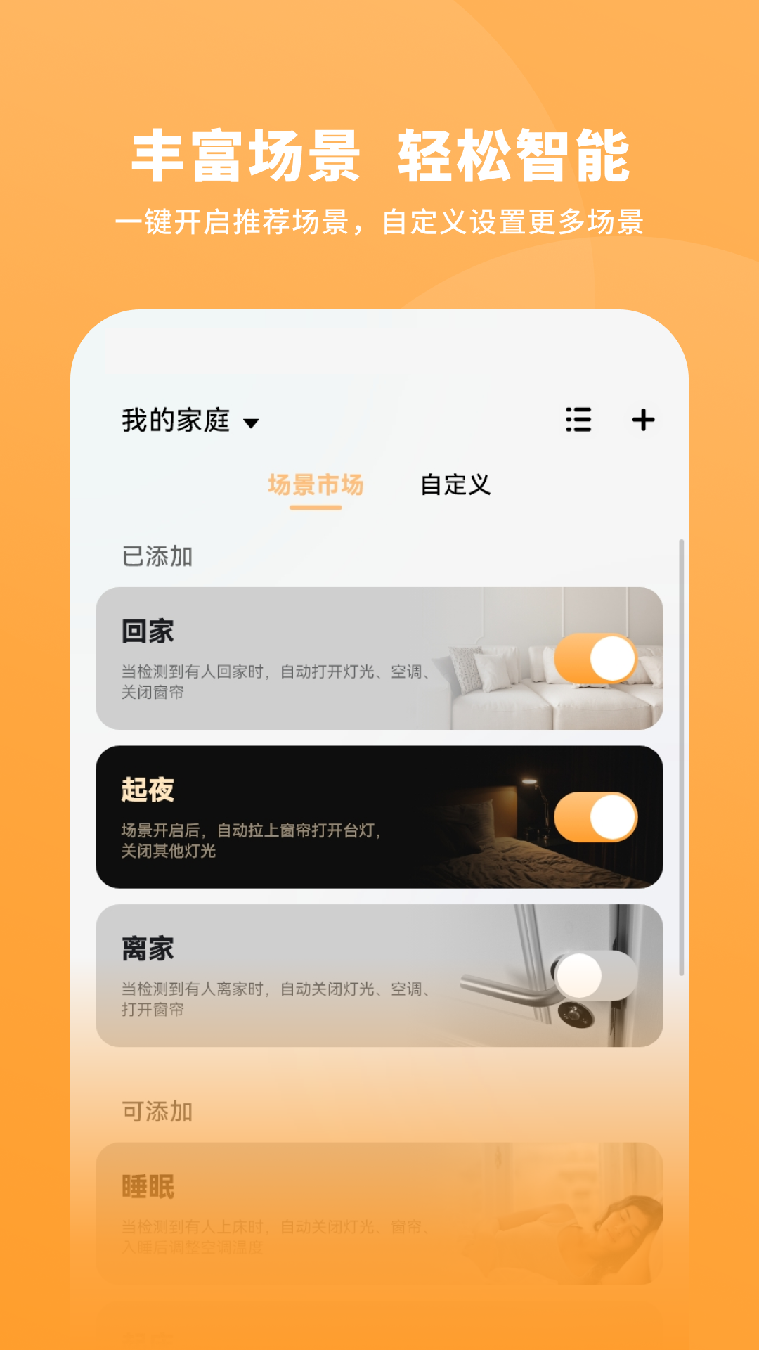 一木一宅App是智能家居的控制中心,通过一木一宅App可以完成手机与智能硬件之间的快捷交互,并实现智能设备间的互联互通;可以对家庭成员的健康数据进行管理,轻松享受居家养老体验;可以使用AI智能场景或者自定义专属场景,来实现真正的智能家居体验。