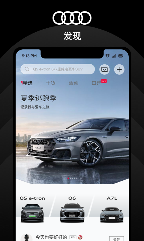 发现:该模块可对首发车型进行3D数字化全景展示,提供新鲜热门的资讯内容、精彩丰富的福利活动以及多元有趣的客户动态信息,让用户能够随时随地浏览精选的优质内容,从而“发现”上汽奥迪更多精彩之处;