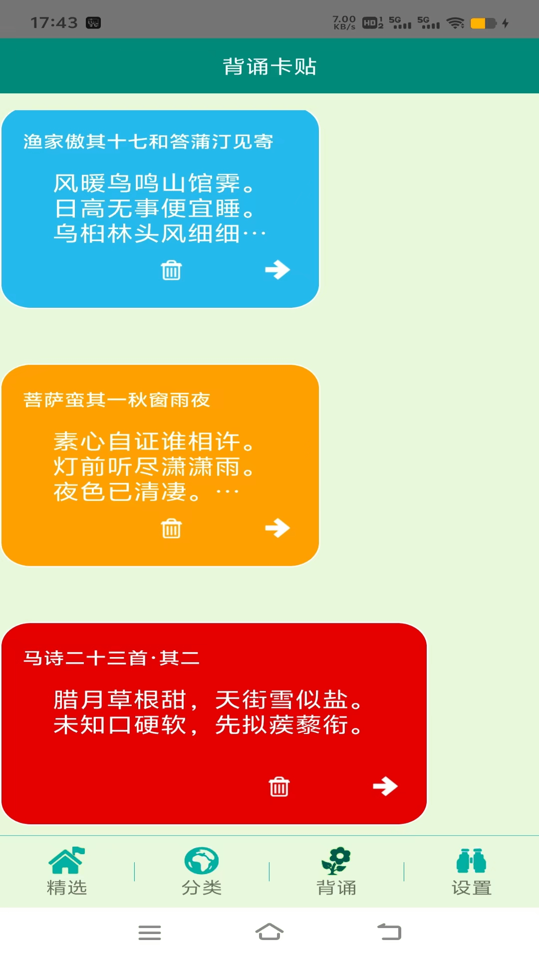 这是一款帮助用户认识和学习中华古代唐诗宋词的学习应用app,软件功能主要包含唐诗宋词的推荐和分类,查看诗词的作者出处和含义,用户还可以添加收藏喜爱的唐诗宋词,收藏的诗词可以去背诵页面以卡片的形式帮助记忆。