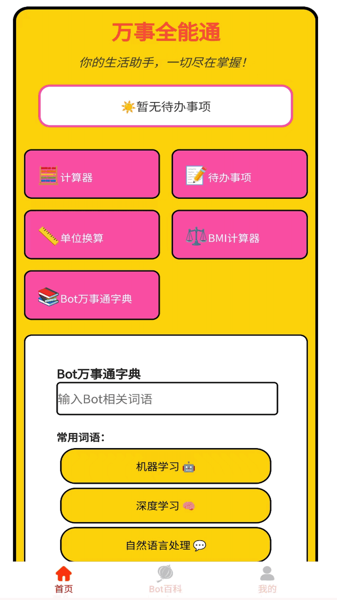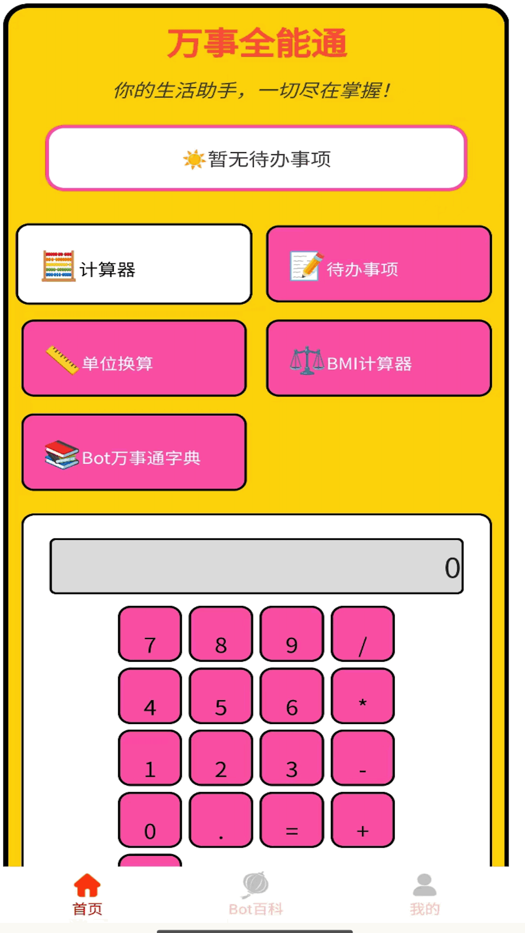 “万事全能通”是一款多功能生活助手应用,旨在帮助用户高效管理日常事务。通过内置的计算器、待办事项、单位换算、BMI计算器等实用工具,用户可以轻松处理各种生活琐事。此外,应用还提供Bot名词百科等功能。无论是工作还是生活,快来下载体验吧~