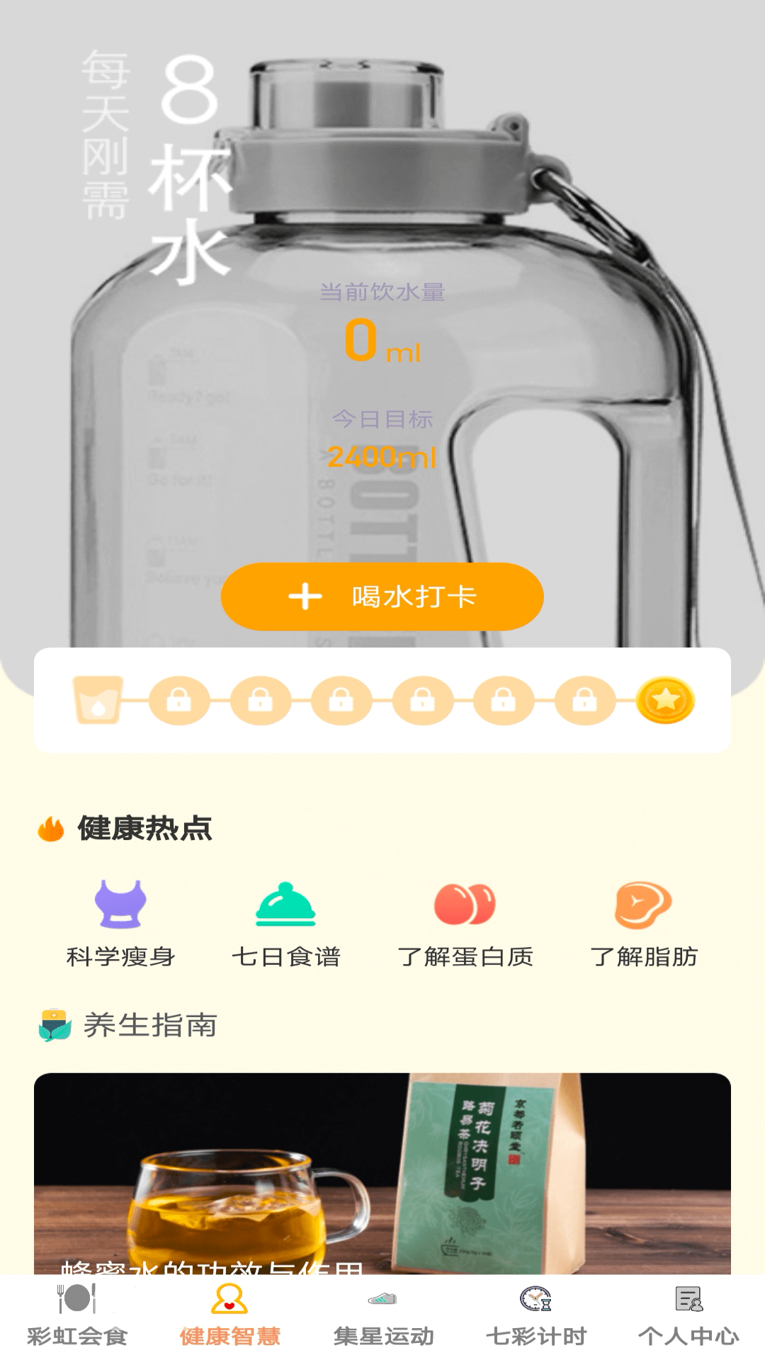 其二,“健康智慧”板块。该板块的功能十分贴心,它不仅会提醒您按时饮水,还为您提供专业的瘦身知识以及养生指南,让健康的生活方式近在咫尺,轻松可得。