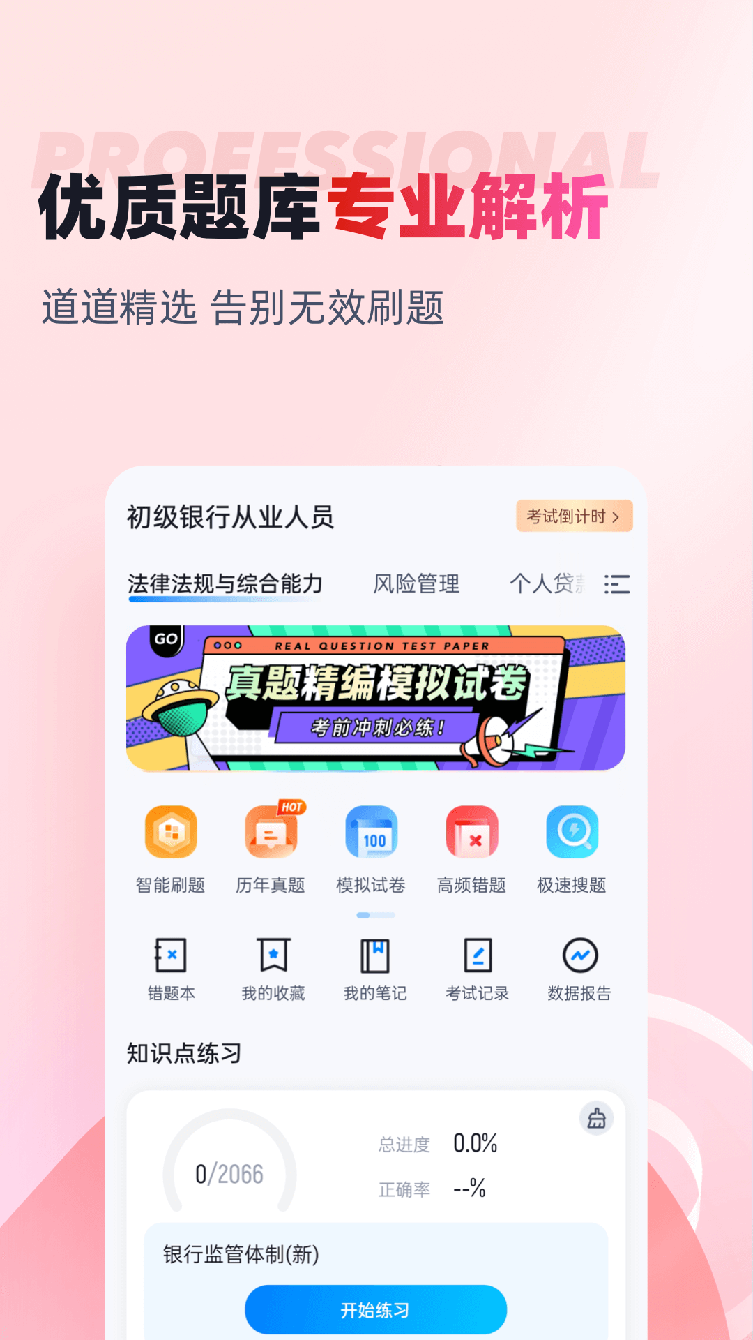 初级银行从业人员考试聚题库涵盖了《银行业法律法规与综合能力》以及《银行业专业实务》这两大板块。在《银行业专业实务》里,又细分出《个人理财》《公司信贷》《个人贷款》《风险管理》《银行管理》这5个专业类别。