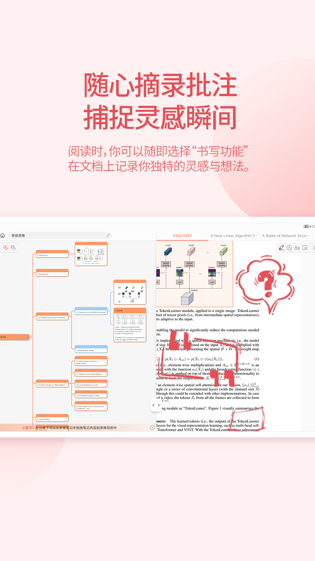 阅读时,你免不了从中萌生出独特的想法。你可以随即选择“书写功能”在文档上写上两笔。别忘了,你的手笔也可以被你摘录成卡片加入到思维导图中的哦!