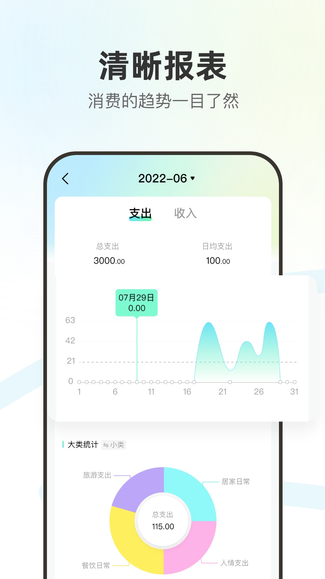 极简的记账流程,纯净的记账体验,丰富的图表展示, 让您随时随地掌握财务状况,及时调整支出告别月光,是您贴心的记账小帮手!