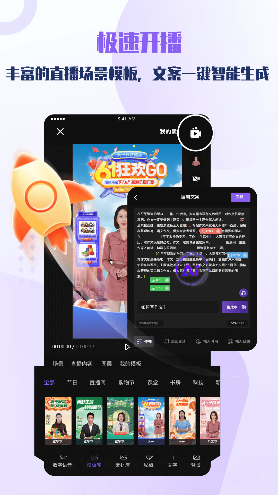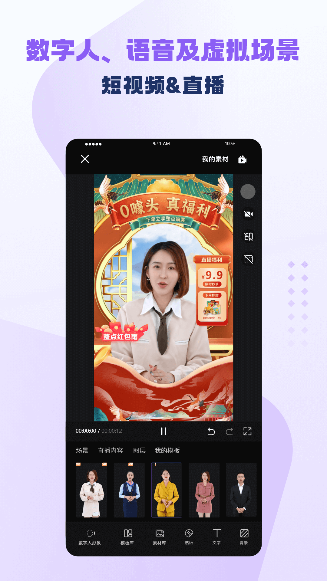 Nvwa智播操作简便,数字虚拟人主播可替代您出镜,既降低成本又提高效率。它拥有海量的通用数字人形象和音色,能满足您多样化的需求。丰富的模板库和素材库确保您的直播内容每天都有新意,不会重复。智能文案功能可高效打造直播文案,解决您为文案内容担忧的困扰。而项目共创和资源共享的特性则使得团队协作变得更加简单、高效。