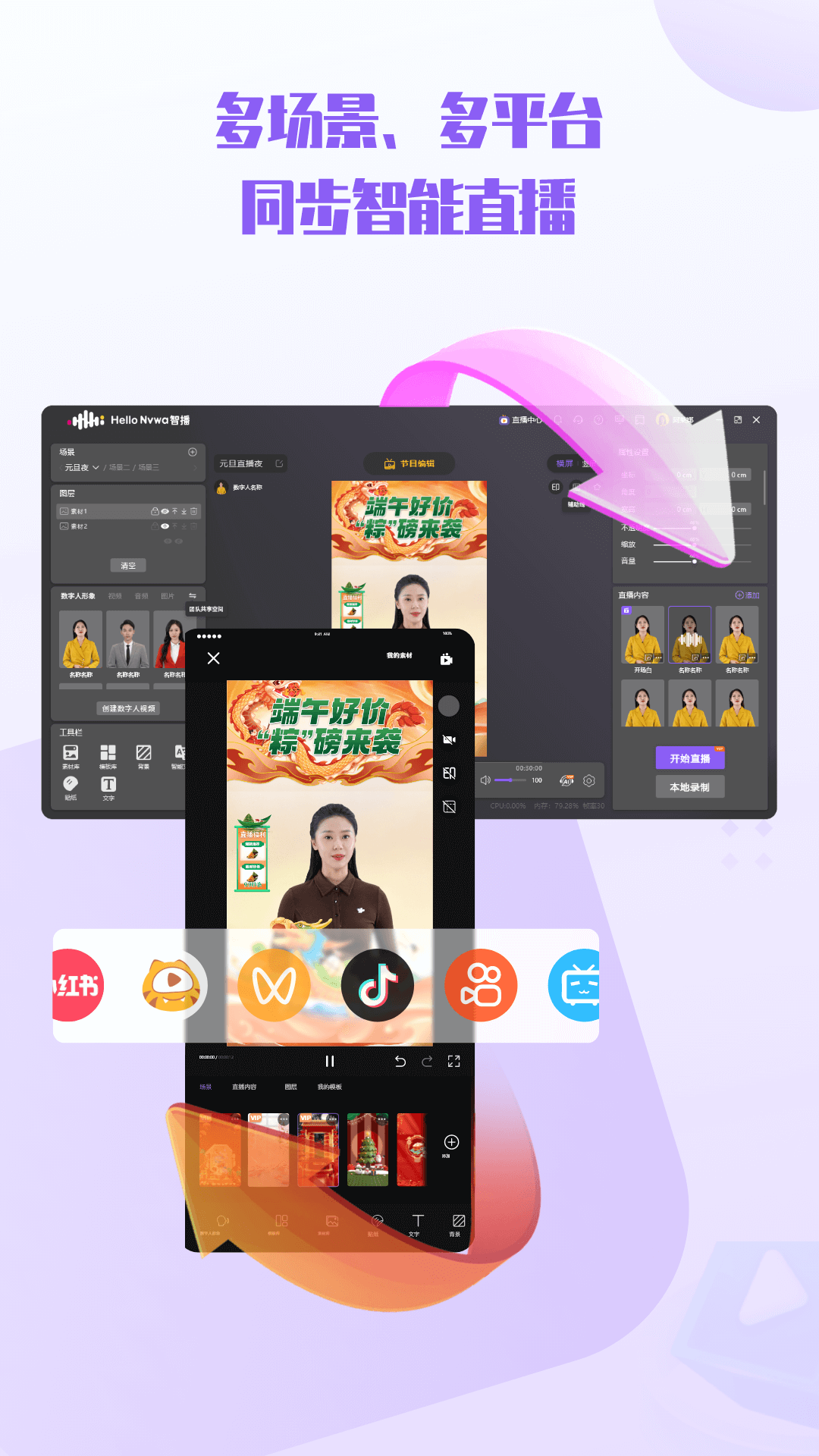 Nvwa智播是一款用于短视频与直播内容制作的工具,其特色在于数字虚拟化,涵盖数字人、语音、虚拟场景等方面。使用这款工具,哪怕是在手机端,也能够轻松完成从搭建直播项目到开启直播的整个数字虚拟化直播内容制作流程。