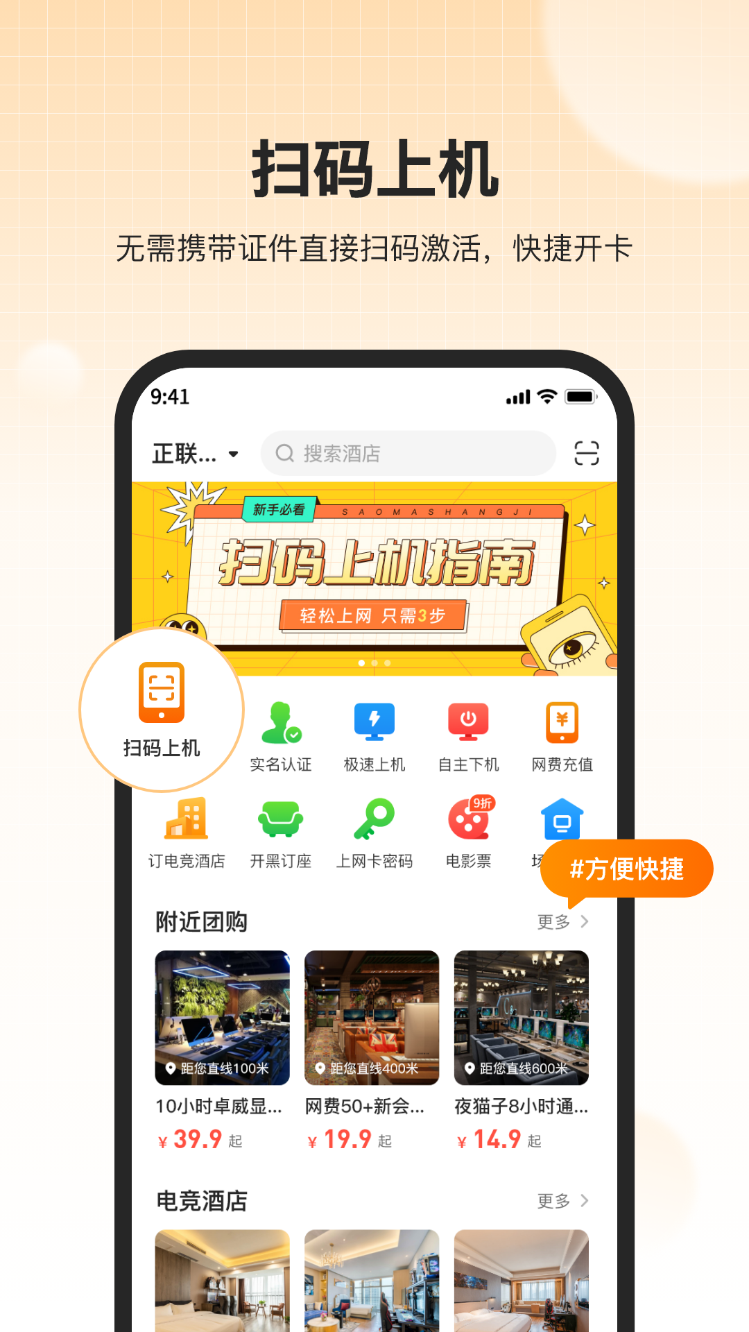 【快捷搜索】可以快速定位您附近的上网营业场所和电竞酒店,还能一键导航过去呢。