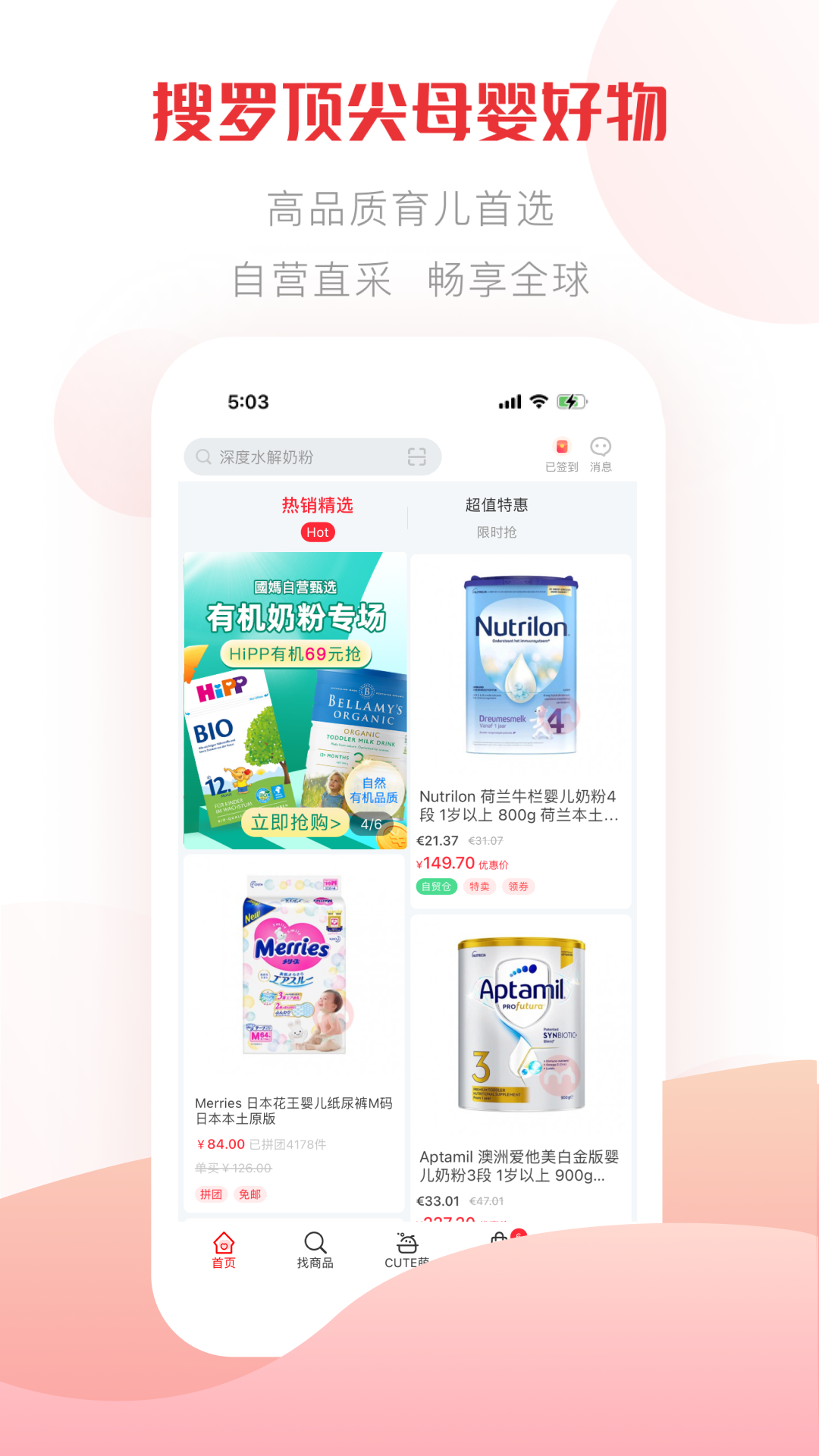 平台汇集全球宝宝用品,如奶粉、婴幼儿辅食营养、纸尿裤、宝宝用品、服装等,是全球母婴产品的汇聚之所。平台整合各地优势资源,以透明、平行的方式展示给用户,使用户通过手机浏览就能查看世界各地产品的品质与价格。