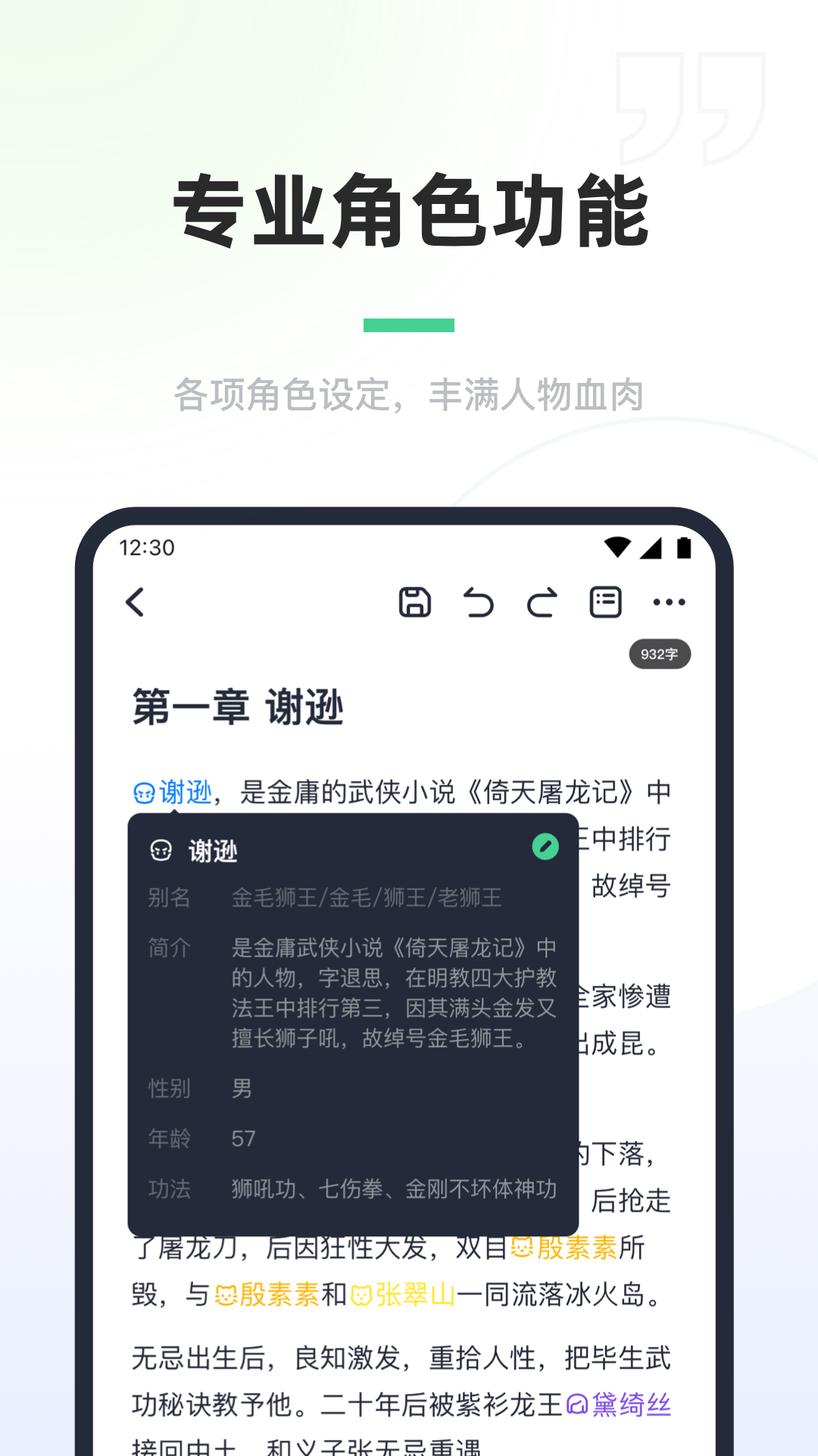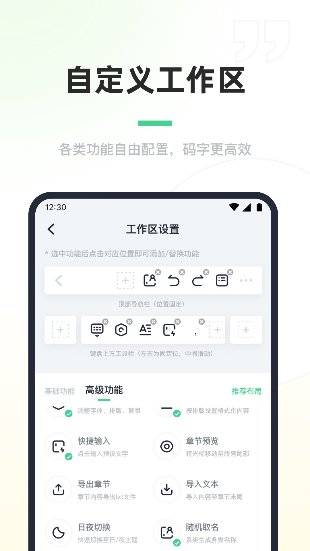 拥有众多实的写作功能:伏笔、角色、小黑屋、休闲拼字、语音朗读、环境音效、段/行聚焦、智能纠错、码字音效、摸鱼提醒、字体阴影效果、实时码字速度、快捷输入、查找替换、全文搜索、长图分享、随机取名、敏感词检测、一键排版、夜间模式、导入字体、自定义工作区等